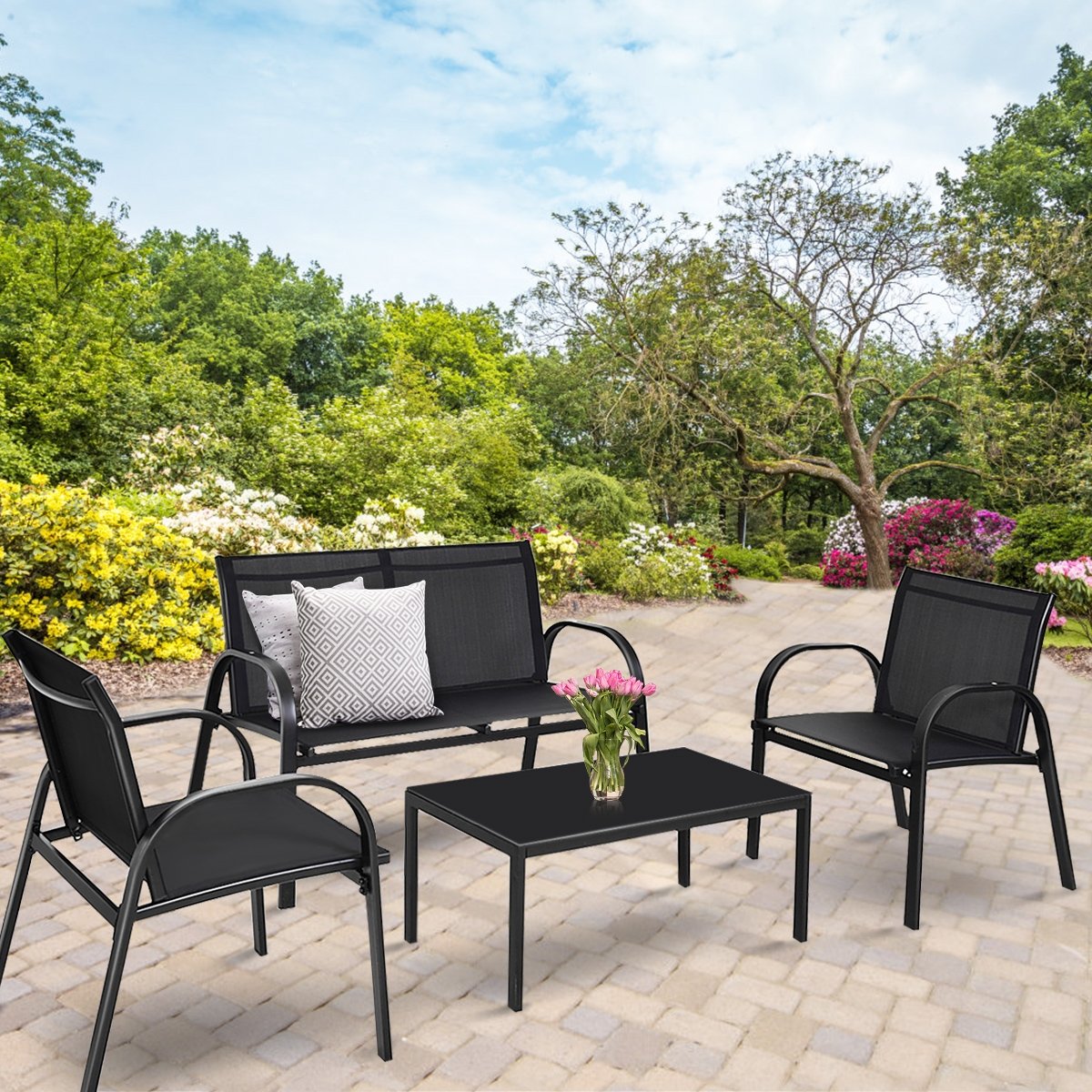 Aproveite seus momentos de lazer ao ar livre com amigos e familiares usando este conjunto de móveis para área externa de 4 peças! Incluindo uma prática mesa de centro, um sofá espaçoso de dois lugares e duas cadeiras aconchegantes, este conjunto oferece ótimos lugares para você passar momentos agradáveis com seus entes queridos. Feito com estrutura de aço resistente à ferrugem e tecido impermeável, este conjunto de 4 peças para área externa é durável e estável para uso prolongado, sendo ideal para áreas externas como piscinas, quintais, jardins e outros locais. Principais características: 【Conjunto de 4 peças】Com uma prática mesa de centro, um sofá espaçoso de dois lugares e duas cadeiras aconchegantes, este conjunto de móveis para área externa de 4 peças oferece um lugar confortável para você, sua família e amigos se reunirem, compartilhando momentos felizes e aproveitando o lazer ao ar livre juntos. 【Construção robusta】Construído com estrutura de aço reforçado, este conjunto de móveis para área externa é estável o suficiente para suportar uma grande capacidade de carga (120 kg para cada cadeira, 240 kg para o sofá de dois lugares e 40 kg para a mesa de centro). Além disso, o revestimento em pó garante que não enferruje. 【Feito para o Conforto】O apoio de braço e o encosto curvos não só oferecem uma experiência aconchegante ao sentar, como também proporcionam excelente conforto para relaxar o corpo. Além disso, este conjunto bistrô de alta qualidade é feito de tecido respirável e impermeável, sendo perfeito para uso externo. 【Ampla Aplicação】Graças ao seu design prático e aparência moderna, este conjunto de móveis para área externa de 4 peças pode decorar perfeitamente seu ambiente interno ou externo. Portanto, você pode usá-lo onde quiser, como à beira da piscina, quintal, pátio, jardim, varanda e outros locais. 【Fácil Instalação】Com instruções detalhadas e fáceis de entender, este conjunto de móveis para área externa de 4 peças é fácil de montar, economizando seu precioso tempo. E a manutenção é bastante simples. Características: Estrutura robusta em aço para alta capacidade de carga. Mesa de centro prática para acomodar diversos itens com facilidade. Ideal para varanda, piscina, quintal, jardim e outros locais. Instruções detalhadas e fáceis de entender para uma montagem simples. Perfeita para uso externo graças à sua estrutura resistente à ferrugem e tecido impermeável. Proporciona uma experiência confortável com cadeiras ergonômicas e sofá de dois lugares. Oferece um local aconchegante para você e seus amigos/familiares se reunirem. Especificações: Cor: Preto. Material: Aço, tecido, vidro. Dimensões da mesa de centro: 80 cm x 45 cm x 37 cm (C x L x A). Dimensões de cada cadeira: 62 cm x 58 cm x 83 cm (C x L x A). Dimensões do sofá de dois lugares: 62 cm x 108 cm x 83 cm (C x L x A). Peso líquido total: 23 kg. Capacidade de carga da mesa de centro: 40 kg. Capacidade de carga de cada cadeira: 120 kg. Capacidade de carga do sofá de dois lugares: 240 kg. O pacote inclui: 1 x Mesa de centro, 1 x Sofá de dois lugares, 2 x Cadeiras. 1 x Manual de Instruções