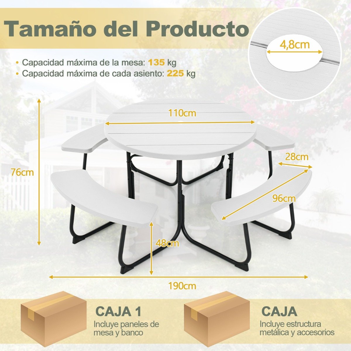 – O pacote será entregue em 2 caixas (Caixa 1 inclui a mesa e os painéis do banco, Caixa 2 inclui a estrutura de aço e ferragens) – O conjunto de mesa de piquenique para 8 pessoas é perfeito para pequenas festas ou encontros – Fabricado com HDPE resistente às intempéries para maior durabilidade – A estrutura de metal com revestimento antiferrugem é estável e durável – A estrutura reforçada em forma de X e a conexão firme aumentam a estabilidade – Orifício embutido para guarda-sol, compatível com guarda-sóis de até 4,8 cm (não incluído) – Tampo da mesa com 4 cm de espessura, sólido para suportar até 136 kg – Protetor antiderrapante protege o piso e os pés de metal – Cantos arredondados para maior segurança e menor risco de ferimentos – Superfície fácil de limpar, economizando tempo na manutenção – Design simples e prático que permite o uso em diversos ambientes