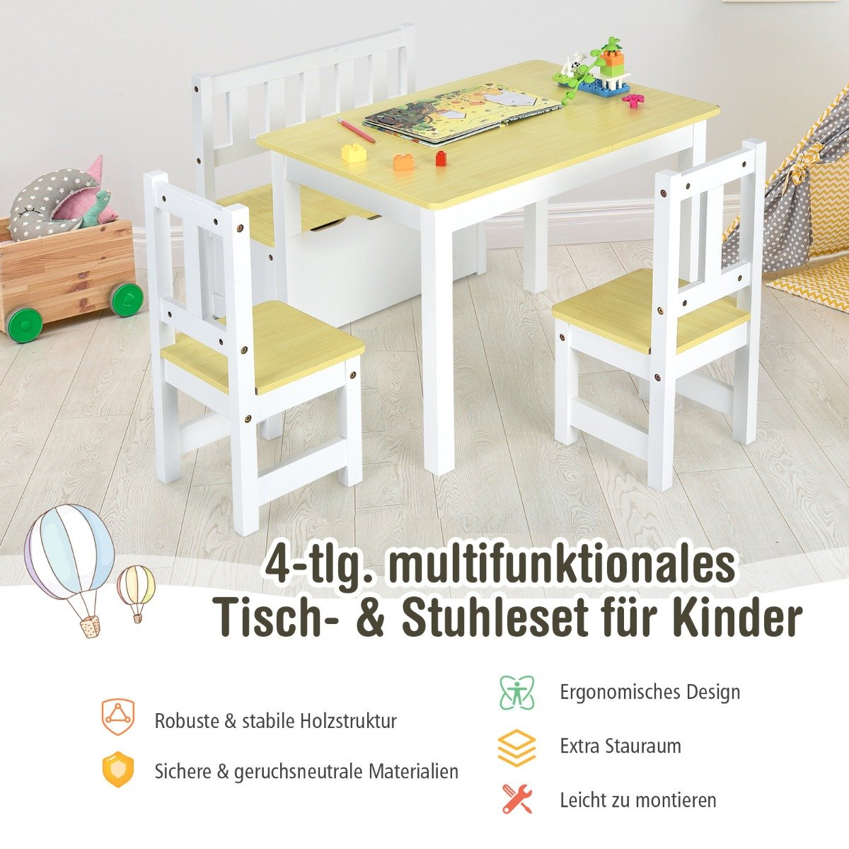 Seus filhos vão se divertir com este conjunto de mesa e cadeiras infantil de 4 peças. Este conjunto de mesa e cadeiras infantil de 4 peças inclui uma mesa, 2 cadeiras e um banco, que pode acomodar de 3 a 4 crianças. Este conjunto de mesa de atividades infantil é adequado para casa e jardim de infância, criando um ambiente confortável para as crianças lerem, brincarem e muito mais. Além disso, o espaço de armazenamento oculto sob o banco oferece espaço suficiente para brinquedos, livros, blocos de construção, etc. Feitas de material MDF premium e madeira de pinho, a mesa e as cadeiras têm estrutura estável e grande capacidade de peso. As bordas lisas e os cantos arredondados protegem as crianças de arranhões, enquanto o design de ranhura segura do banco de armazenamento evita que os dedos sejam beliscados. Fácil de montar e limpar, este conjunto de mesa e cadeiras infantil será um ótimo presente para seus filhos. Ponto de bala: Conjunto de mesa de atividades de 4 peças para crianças pequenas: Este conjunto de mesa infantil vem com uma mesa, 2 cadeiras e um banco longo, acomodando de 3 a 4 crianças ao mesmo tempo. Este conjunto de mesa infantil cria um ambiente confortável para as crianças lerem, brincarem e desenharem, adequado para casa, creche, jardim de infância e muito mais. Banco com amplo espaço de armazenamento oculto: Graças ao design compacto, o banco longo com amplo espaço de armazenamento oculto oferece espaço suficiente para brinquedos, livros, roupas, sapatos, lanches, ferramentas de pintura, etc. Não é apenas conveniente para pais ou professores organizarem, mas também ajuda as crianças a desenvolverem um bom hábito de organização. Estrutura estável e design seguro: Construído com MDF resistente e madeira de pinho, este conjunto de mesa e cadeiras infantis apresenta excelente estabilidade e capacidade de peso, com longa vida útil. As bordas lisas e os cantos arredondados protegem as crianças de arranhões, enquanto o design de ranhura segura do banco de armazenamento evita que os dedos sejam beliscados. Dimensões adequadas para seus filhos: O encosto ergonômico garante uma experiência confortável ao sentar. Além disso, os tamanhos da mesa e das cadeiras são especialmente projetados para crianças. Dimensões da mesa: 70 x 48 x 50 cm (C x L x A). Dimensões da cadeira: 25 x 25 x 55 cm (C x L x A). Dimensões do banco: 58 x 26 x 53 cm (C x L x A). Fácil de montar e manter: equipado com instruções passo a passo e os acessórios necessários, este conjunto de mesa e cadeira de atividades para crianças é fácil e rápido de montar. Além disso, a superfície lisa e impermeável facilita muito a limpeza diária, sendo fácil limpá-lo com um pano úmido. Características: O conjunto de mesa de atividades infantil de 4 peças inclui uma mesa, 2 cadeiras e um banco Dimensões adequadas e encosto ergonômico para uma experiência confortável ao sentar Grande espaço de armazenamento oculto do banco para armazenamento conveniente Estrutura estável feita de MDF de alta qualidade e madeira de pinho Bordas lisas e cantos arredondados protegem as crianças de arranhões O design de ranhura segura do banco de armazenamento evita que os dedos sejam presos Fácil de montar com instruções detalhadas e acessórios necessários A superfície lisa e à prova d’água permite que você limpe o conjunto de mesa sem esforço Cria um ambiente confortável para as crianças lerem, brincarem e desenharem Adequado para vários lugares, como casa, creche, jardim de infância, etc.
