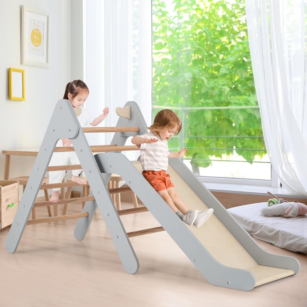 Triângulo de escalada com escorregador. Estrutura de escalada em madeira. Triângulo com degraus para escorregar e escalar. Cinza.
