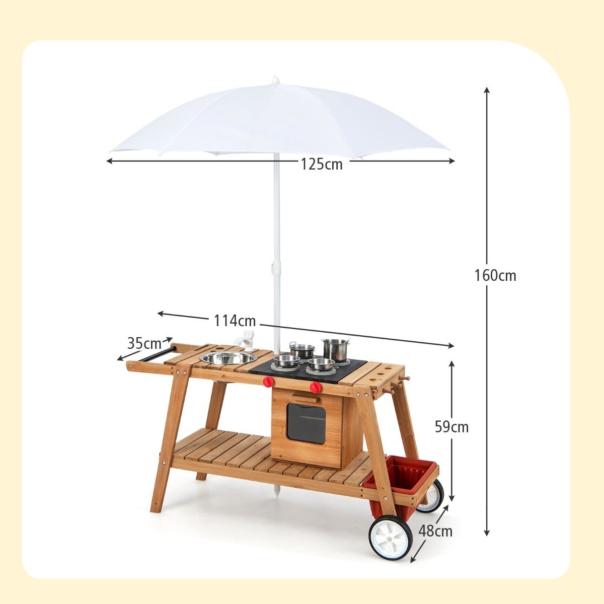 Você ainda está procurando um brinquedo divertido para seu filho pequeno? Não perca este carrinho de madeira com guarda-sol. Ele tem botões giratórios, um assador simulado, uma torneira fofa e uma pia para manter as crianças entretidas. O guarda-sol adicional pode bloquear a luz do sol e a garoa e permite que as crianças brinquem em uma área confortável. Ele também vem com 2 panelas de brincar, 2 potes de brincar e 1 pequeno batedor para que as crianças possam cozinhar como um verdadeiro chef. Quando as crianças precisam armazenar comida de brinquedo, ele tem 1 forno de armazenamento, 1 caixa removível e 3 ganchos para pendurar. As crianças vão adquirir o hábito de organizar itens diferentes. Com a ajuda de uma mão de empurrar e 2 rodas duráveis, as crianças podem mover o carrinho sem esforço. Além disso, é feito de material de madeira de abeto de alta qualidade para garantir o uso a longo prazo. Atributos: Experiência de culinária interativa: Este carrinho de brinquedo oferece às crianças uma experiência de culinária real. As crianças podem ligar o fogão com os botões de "clique", cozinhar com panelas e frigideiras e lavar vegetais ou frutas na torneira. Ele também vem com uma vassoura de cozinha para seu pequeno chefe usar. Guarda-sol e rodas giratórias: Projetado com 1 guarda-sol removível, este carrinho portátil protege as crianças da luz solar forte e fornece a elas uma área de lazer legal. Quando não estiver em uso, o guarda-sol pode ser facilmente fechado para economizar espaço. Ele também é equipado com 1 barra de empurrar e 2 rodas giratórias, que facilitam a movimentação do carrinho pelas crianças. Estrutura de madeira de abeto natural: Feito de material de madeira de abeto selecionado, este carrinho de brinquedo permite alta resistência e excelente estabilidade para durabilidade duradoura. O carrinho é seguro o suficiente para crianças de 3 anos ou mais. Bordas sem rebarbas evitam arranhões. Espaço de armazenamento embutido: Armário fechado com prateleira, prateleira de armazenamento aberta e caixa de armazenamento lateral permitem que as crianças coloquem seus utensílios de cozinha. Ao mesmo tempo, você pode pendurar seus utensílios de cozinha em 3 ganchos. Diferentes opções de armazenamento ajudam as crianças a organizar melhor seus itens. Presente ideal para seus filhos: Será uma opção perfeita para os aniversários de seus filhos ou outros festivais. O carrinho mede 114 cm x 48 cm x 66 cm (C x L x A) (excluindo o guarda-sol), tornando fácil para as crianças acessarem vários itens. Seu pequeno chefe pode usá-lo para melhorar suas habilidades culinárias, habilidades sociais e criatividade. Características: Botões giratórios, fogão fofo, torneira, pia e assadeira para cozinhar de verdade Inclui 2 panelas de aço inoxidável, 2 potes de aço inoxidável e 1 batedor de cozinha O guarda-sol protege da luz solar e traz frescor 1 barra de empurrar e 2 rodas giratórias para fácil movimentação Material de madeira natural para alta durabilidade Fecho magnético para fechamento sem esforço Janela visível para as crianças verem a comida de brinquedo dentro Pernas de suporte estáveis mantêm-no estável no chão Oferece várias opções de armazenamento Ideal para cozinhar, socializar, habilidades práticas e criatividade das crianças