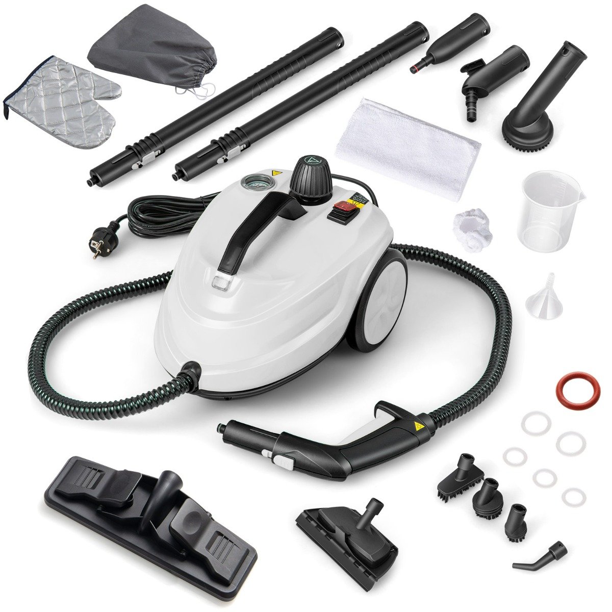 Transforme sua casa em um paraíso cintilante com nosso limpador a vapor ultraeficiente de 2000 W! Aquece em apenas 8 minutos e libera um poderoso vapor de 5 bar a 160 ° C que elimina facilmente a gordura e a sujeira, sem produtos químicos! Desfrute da liberdade de uma limpeza prolongada com um tanque colossal de 1,8 L que oferece 30 minutos ininterruptos, cobrindo grandes áreas de uma só vez. Vem com um kit de 15 peças projetado para todos os desafios de limpeza: pisos, janelas e até tecidos! Fácil navegação e manuseio com cabos longos e rodas de rolamento suave. Além disso, a trava de segurança garante tranquilidade. Atributos: 【Vapor potente de alta temperatura】Desfrute de uma limpeza profunda e completa, sem produtos químicos, com o limpador a vapor de 2000 W. Ele aquece rapidamente em apenas 8 minutos, fornecendo um vapor robusto de 5 bar a 160 ° C que remove facilmente a gordura e a sujeira em várias superfícies. 【Tanque grande, menos recargas】Mantenha suas sessões de limpeza ininterruptas com o esfregão a vapor, com um grande tanque de água de 1,8 L que fornece até 30 minutos de vapor contínuo, ideal para cobrir áreas de até 108 m². O reabastecimento é fácil, graças ao funil e ao jarro medidor incluídos. 【Acessórios tudo-em-um】Enfrente qualquer desafio de limpeza com o versátil kit de acessórios de 15 peças. Seja para limpar pisos, janelas, espelhos ou passar estofados, o limpador a vapor pressurizado com seu conjunto completo de acessórios tem o que você precisa. 【Movimento fácil, alcance extra】Projetado para conveniência e alcance, esta máquina de limpeza portátil possui uma mangueira flexível de 142 cm, 2 tubos de extensão e um cabo de alimentação de 500 cm, sem necessidade de se curvar ou ajoelhar! A manobrabilidade é fácil com sua alça de aderência, rodízio universal e 2 rodas unidirecionais. 【Design Seguro】Priorize sua segurança com os recursos cuidadosamente projetados deste versátil limpador a vapor. Ele possui um gatilho de vapor com trava de segurança para evitar o uso acidental e uma tampa do tanque que atua como uma válvula de segurança, garantindo uma vedação alta e segura durante o uso.