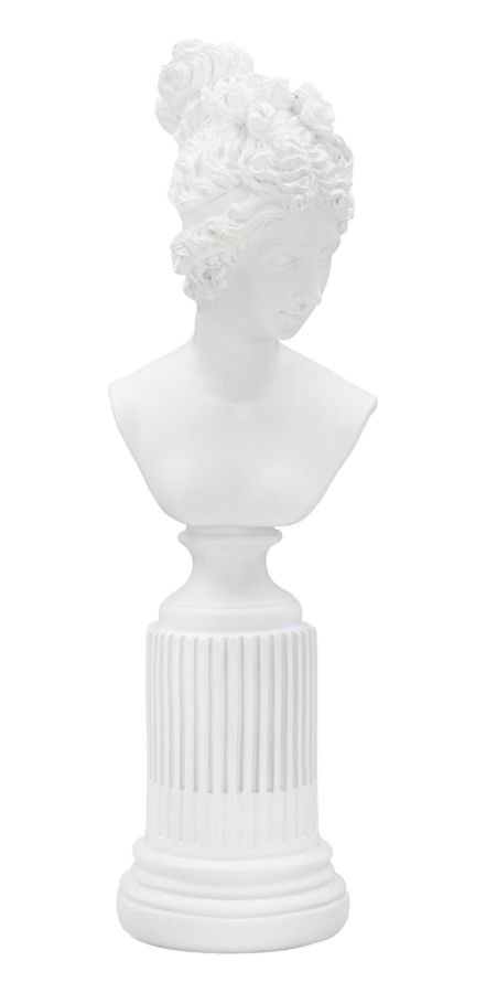 Elegante estátua de busto de mulher apoiado em uma coluna. As linhas lembram a arte clássica.