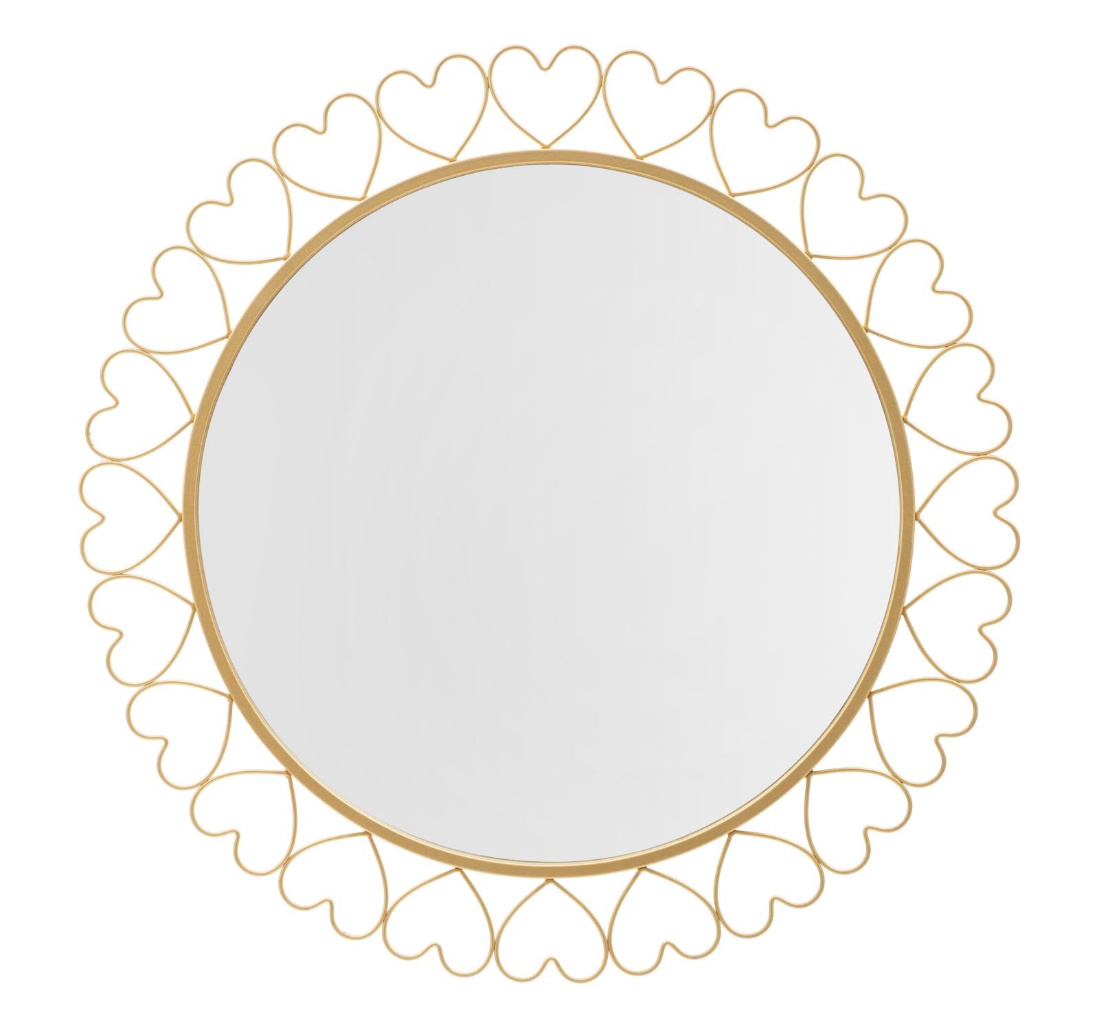 Espelho redondo de parede em metal dourado com moldura composta por ternos corações. Um toque de delicadeza para embelezar qualquer ambiente.