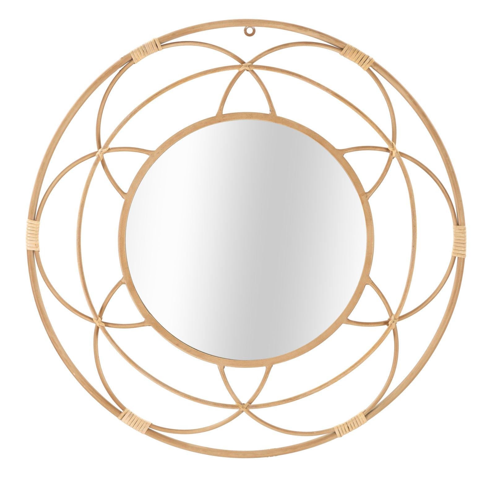 Espelho de parede redondo com moldura realizada com acabamento geométrico que lembra uma flor e embelezado com acabamentos em rattan.