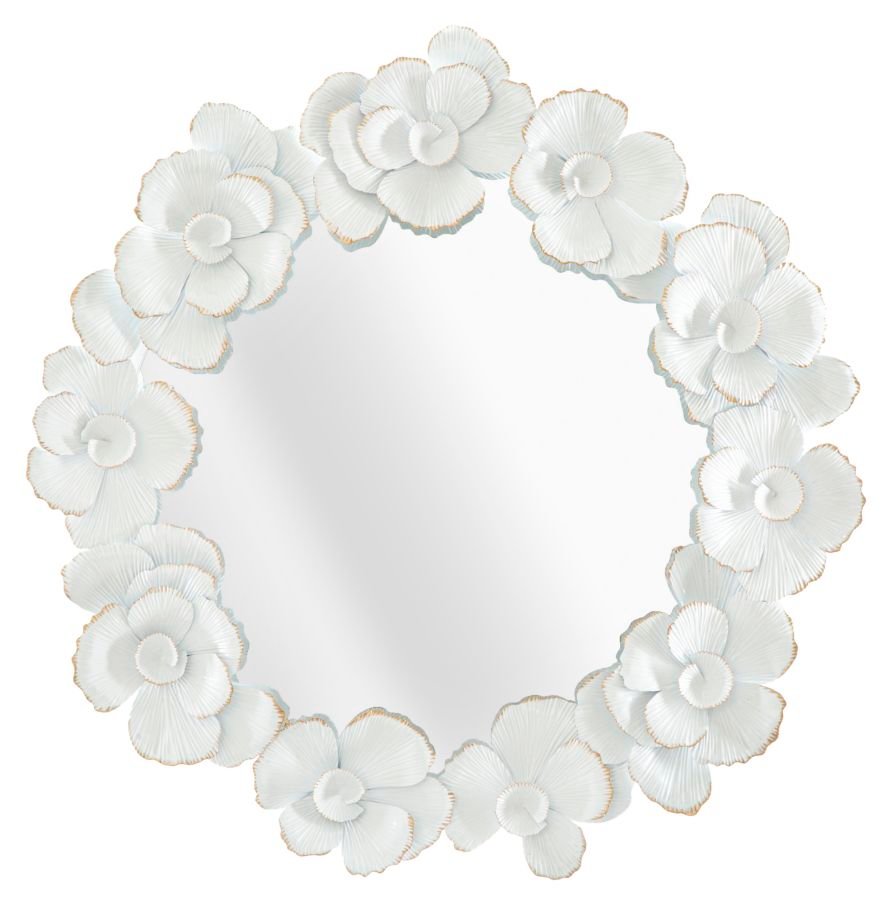Espelho redondo em metal branco com elegantes flores decorativas com perfis dourados. Os espelhos são um elemento indispensável para dar brilho a um mobiliário glamoroso. Ampliam opticamente os espaços e criam um ponto de luz sofisticado.