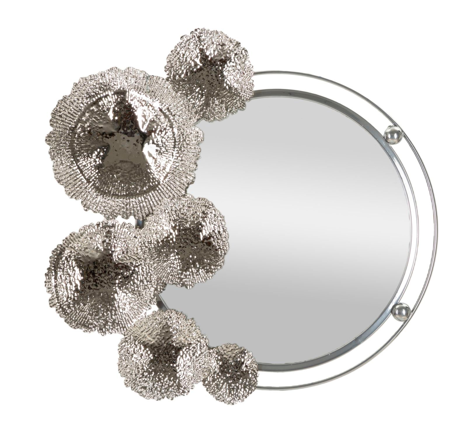 Espelho de parede em metal adornado com aplicações prateadas que lembram delicadas flores, acrescentam um toque de elegância e requinte a qualquer ambiente.