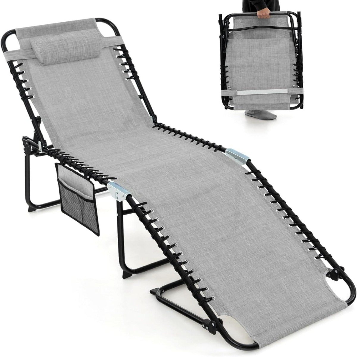 Espreguiçadeira dobrável para jardim com encosto ajustável, cinza, com apoio de cabeça e bolso lateral.Espreguiçadeira dobrável para jardim com encosto ajustável, cinza, com apoio de cabeça e bolso lateral.