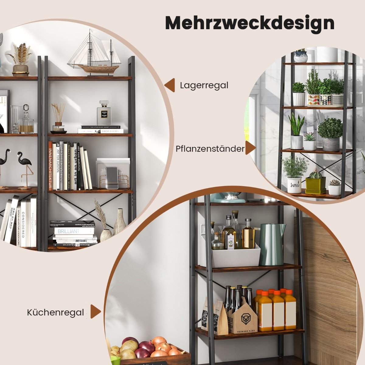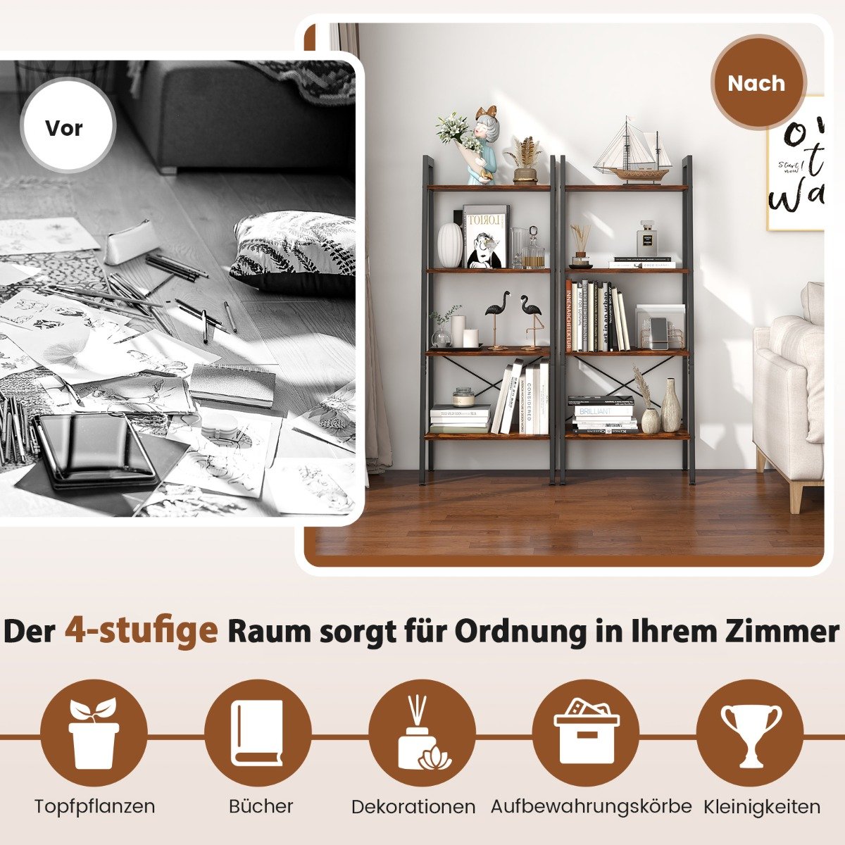 Estante de 4 níveis com estrutura de metal – marrom