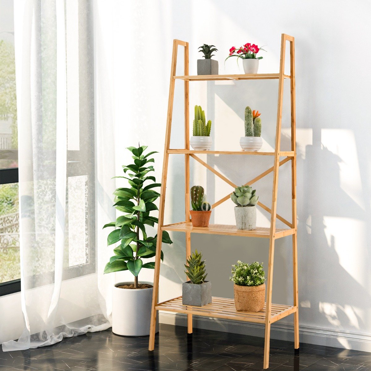 Estante de bambu em formato de escada, com 4 níveis e 58 polegadas (147 cm) de altura – Cor natural