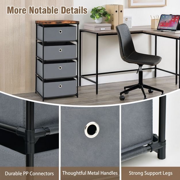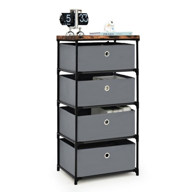 A cômoda de grande capacidade ajuda a manter seu quarto arrumado e limpo! Seja para um quarto ou um escritório, este armário de armazenamento com 4 gavetas grandes é o ajudante de armazenamento perfeito. Ele segura todos os seus itens do dia a dia perfeitamente, incluindo roupas, cosméticos, livros e muito mais. Além disso, o topo largo é perfeito para um despertador ou luminária de mesa. A estrutura de metal resistente garante que o armário seja estável, enquanto as alças vazadas facilitam o acesso aos seus pertences. O formato elegantemente simples o torna não apenas funcional, mas também uma peça de mobiliário decorativa com valor estético. Amplo espaço de armazenamento: esta cômoda tem 4 gavetas extra grandes e um tampo de mesa largo. Cada gaveta não tecida de 16,5 L pode conter mais de 10 camisas e é perfeitamente adequada para todas as suas necessidades de armazenamento. Além disso, cada gaveta possui alças vazadas sofisticadas para facilitar o acesso ao conteúdo. Materiais resistentes e estrutura robusta: A superfície deste armário de armazenamento é feita de tecido não tecido de alta qualidade, que é mais resistente do que outros armários leves e é adequado para uso a longo prazo! Além disso, o armário tem uma estrutura de metal forte, o que torna a estrutura mais estável e não oscila. Design dobrável inteligente: Esta cômoda é compacta em tamanho e não ocupa muito espaço no chão. Além disso, ao remover a parte inferior da gaveta, você pode dobrá-la facilmente. Dessa forma, você pode desmontar e guardar o armário facilmente para um layout de móveis mais flexível. Unidade de armazenamento elegante e moderna: Com suas linhas limpas e formato clássico, esta cômoda com várias gavetas pode ser combinada com uma variedade de estilos de decoração. Você pode usá-la como uma unidade de armazenamento no escritório ou como mesa de cabeceira no quarto. Não há dúvida de que esta unidade de armazenamento prática e bonita deixará sua casa mais organizada e limpa. Fácil de instalar: Um manual de instruções detalhado está incluído na embalagem do produto para ajudá-lo a concluir a montagem rapidamente. Todas as peças do armário serão numeradas. Além disso, ao instalar o gabinete, você só precisa inserir os tubos de metal nos elos. O design prático ajuda você a economizar tempo e esforço.