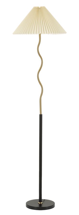 Candeeiro de pé em metal preto e prateado com design suave e sinuoso. Completo com abajur em tecido plissado branco.