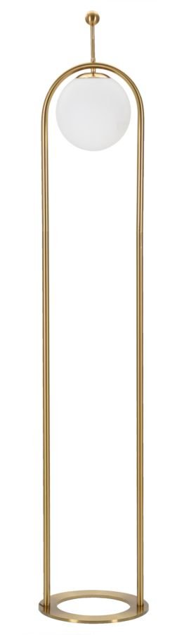 Candeeiro de pé em metal dourado com linhas simples e uma elegante esfera de abajur em vidro branco.