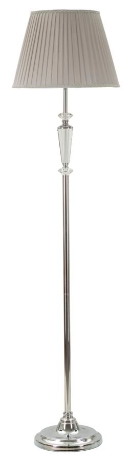 Candeeiro de pé elegante em metal prateado e vidro. Completo com abajur de tecido cinza com acabamento em cinza escuro.