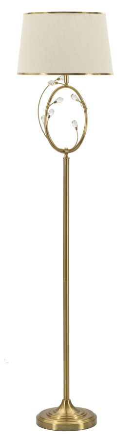 Candeeiro de pé em metal dourado com decoração geométrica com aplicações elegantes que lembram flores. Completo com abajur de tecido bege com detalhes dourados.