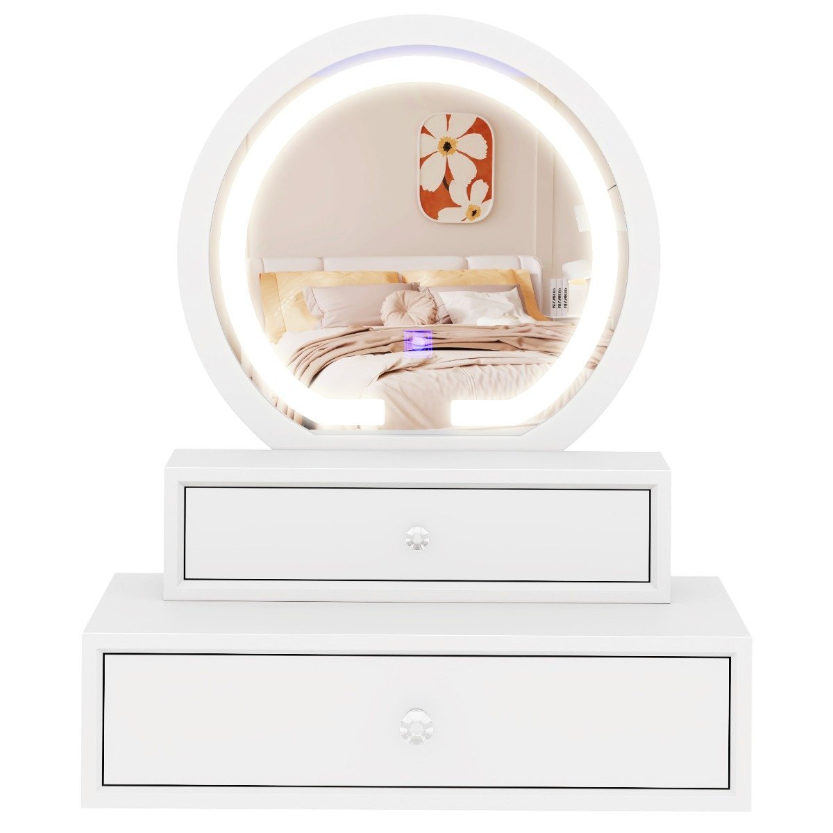 Você ainda está procurando um espelho de maquiagem prático e que economize espaço? Então experimente nosso elegante e funcional espelho de maquiagem de mesa. Ele nunca irá decepcionar! Feito de MDF de alta qualidade, este espelho de maquiagem é resistente e durável. As duas gavetas práticas oferecem amplo espaço para toda a sua maquiagem. Os puxadores de cristal transparente garantem uma abertura fácil e adicionam um toque de elegância. Além disso, as gavetas podem ser separadas do espelho, permitindo que você as organize como desejar e as coloque onde quiser. Finalmente, o prático espelho de maquiagem também pode ser montado na parede, acima da pia, em uma mesa ou colocado completamente separado, economizando ainda mais espaço no chão! Adicione este espelho de penteadeira ao seu carrinho agora. Seu visual simples e elegante irá realçar instantaneamente sua decoração. Atributos: Espelho de vidro grande: Localizado bem no centro, a uma altura conveniente, está um espelho de vidro redondo que reflete cada poro do seu rosto ainda mais claramente e sem distorção. Você pode verificar sua maquiagem ou penteado para garantir que esteja fabulosa quando sair para jantar. Amplo armazenamento e Arranjo flexível: equipado com duas gavetas grandes, este espelho de maquiagem oferece amplo espaço para manter todos os seus cosméticos organizados. As gavetas também podem ser facilmente destacadas do espelho, permitindo que você as organize como desejar. A alça de cristal realça o estilo simples e fornece fácil acesso aos seus itens. Material de alta qualidade e fácil instalação: feito de material MDF E1 com uma superfície resistente a rachaduras, o espelho de mesa é resistente e durável, garantindo que ele irá atendê-lo bem por um longo tempo. Como não são necessárias ferramentas adicionais e com a ajuda do manual de instruções fácil de seguir, você pode concluir a instalação de forma rápida e fácil. Além disso, a superfície lisa é fácil de limpar e manter. Colocação na parede ou na mesa: para economizar ainda mais espaço no chão, você pode facilmente montar este espelho de maquiagem na parede ou colocá-lo em sua mesa ou cômoda, permitindo que você utilize seu espaço de vida de forma eficiente. Este espelho de parede redondo é definitivamente perfeito para o banheiro, quarto ou qualquer outro local com espaço limitado. Aparência simples, mas elegante: Apresentando um exterior moderno, este espelho de mesa combina beleza estética com praticidade. Puxadores de cristal requintados e um acabamento branco adicionam um toque de elegância. É o presente perfeito para mulheres e meninas em ocasiões especiais como Dia dos Namorados, Natal, aniversários, etc. Características: Feito de placas de MDF de alta qualidade para estabilidade e durabilidade Superfície lisa e pintada, sem cheiro, fácil de limpar Oferece espaço suficiente para joias, maquiagem e outros acessórios Design de parede para aproveitar ao máximo seu espaço Altura livremente ajustável, dependendo de suas necessidades de maquiagem Ambas as gavetas podem ser removidas da parte do espelho para se adaptar às suas necessidades A aparência elegante e estilosa o torna um objeto decorativo perfeito em qualquer ambiente Pode ser usado na penteadeira, como espelho de maquiagem de banheiro, prateleira de parede ou espelho de penteadeira e para muitos outros propósitos Puxadores de cristal de primeira classe para fácil abertura e fechamento de gavetas Construção leve necessária