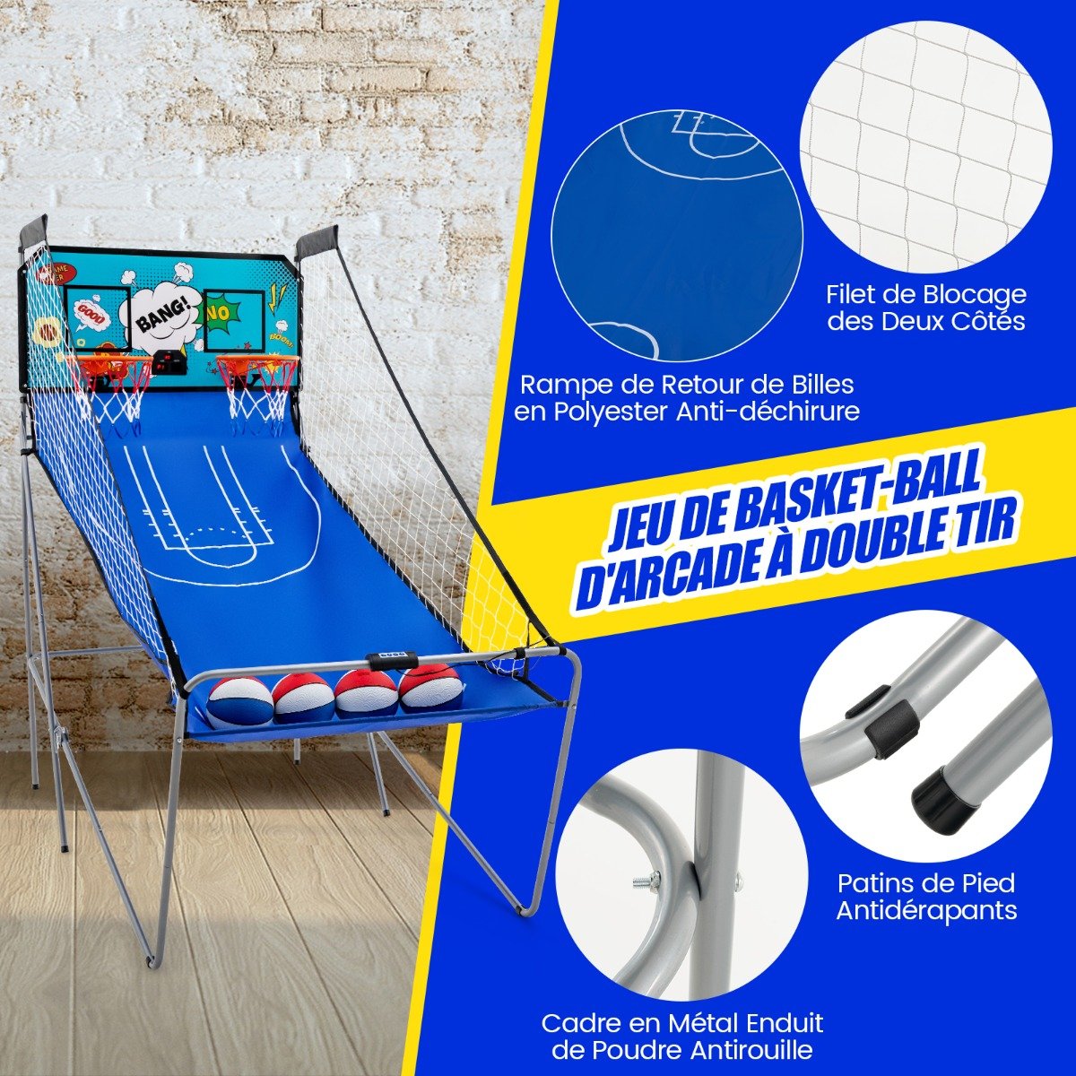 Transforme seu quarto em um fliperama emocionante com o Double Hoop Basketball Arcade Game. Com 8 modos de jogo, este jogo oferece entretenimento sem fim para jogadores de todas as idades. O placar eletrônico exibe pontuações precisas e em tempo real. A estrutura de metal é estável e durável para uso a longo prazo. E o painel forte é equipado com aros de cesta resistentes e redes grossas. Por último, mas não menos importante, o design dobrável permite fácil armazenamento. Melhore sua experiência de basquete e crie ótimas memórias com esta emocionante máquina de fliperama. Atributos: Jogo divertido para todas as idades: Este jogo de basquete dobrável de 2 aros é o complemento perfeito para qualquer sala de jogos, porão ou quintal. É adequado para 1 a 4 jogadores e apresenta 8 modos de jogo com efeito sonoro: vencer o relógio, arremesso de 3 pontos contra o relógio, revidar, cavalo, ponto de verificação, ao redor do mundo, arremesso esquerdo e direito e um contra um. Construção de alta qualidade: A estrutura de metal com revestimento em pó à prova de ferrugem e as almofadas antiderrapantes para os pés garantem estabilidade durante jogos intensos, enquanto a tabela robusta e à prova de estilhaços pode suportar inúmeros impactos. Além disso, a tabela de alta qualidade tem duas bordas de cesta de 31 cm com rede. Sistema de pontuação eletrônica: O visor digital fornece informações precisas sobre a pontuação e o jogo, adicionando um elemento emocionante e desafiador aos seus jogos de basquete. Observação: Requer 3 pilhas AA (não incluídas). Dobrável para fácil armazenamento: Este jogo de basquete arcade apresenta um design dobrável e se dobra em segundos para armazenamento com economia de espaço, tornando-o perfeito para espaços pequenos ou para aqueles que procuram maximizar sua área de estar. Observação: Certifique-se de que os pinos de travamento sejam inseridos quando dobrados. Fácil montagem e acessórios incluídos: O design de trava de mola permite a conexão rápida dos tubos de metal e os fechos de velcro simplificam a instalação da rede. A entrega inclui 4 bolas de basquete (diâmetro 17 cm) e 1 bomba de inflação. Características: Oferece diversão sem fim com 8 modos de jogo diferentes Controle ou altere facilmente as configurações pelo painel de controle Equipado com um sistema de pontuação eletrônico para contagem precisa Adequado para 1 a 4 jogadores, por exemplo, crianças, adolescentes e adultos Feito com rede de bloqueio em ambos os lados para economizar tempo na coleta de bolas Durabilidade confiável com rampa de retorno de bolas de poliéster resistente a rasgos Construção estável com estrutura de metal, painel traseiro de MDF e borda de metal Dobrável rapidamente e economiza espaço quando não estiver em uso Fácil montagem graças às instruções detalhadas