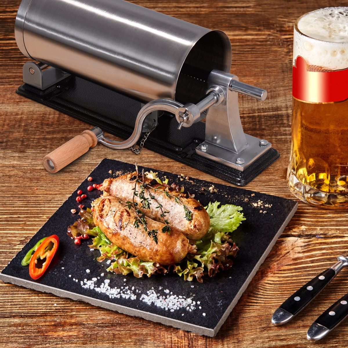 Novo e de alta qualidade, design horizontal, construção durável em alumínio de alta qualidade, fácil de operar e limpar, acompanha 4 tubos para salsicha de tamanhos diferentes, silencioso, ideal para uso doméstico ou comercial.