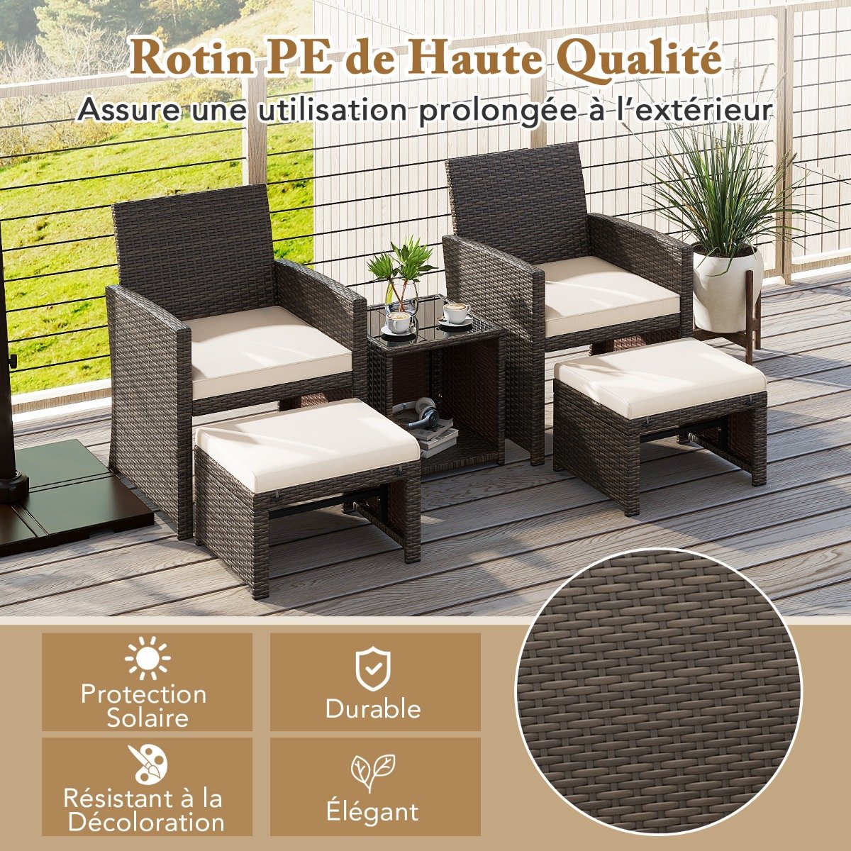 Nossos móveis de vime são realmente lindos, tornando-os o complemento perfeito para o seu jardim! Composto por 5 peças, inclui 2 poltronas, 2 pufes e 1 mesa de centro com tampo de vidro. A poltrona e o pufe são suportados por uma estrutura de aço resistente e reforçados por uma estrutura em forma de X, tornando o conjunto resistente às intempéries e durável. Graças ao estofamento, o assento oferece um alto nível de conforto. Os zíperes também facilitam a remoção e a lavagem das capas. A mesa oferece bastante espaço para guardar itens. Atributos: Conjunto de 5 peças de vime PE: Seja para convidar amigos ou curtir uma noite em família, este conjunto de 5 peças de vime PE é ideal. O vime não desbota e pode ser usado ao ar livre por muito tempo. A estrutura em forma de X garante estabilidade e capacidade de carga. Confortável e versátil: o encosto e os braços das poltronas apoiam o corpo e garantem conforto. Os pufes também podem ser usados como assento ou como apoio para os pés e podem ser guardados sob as poltronas para economizar espaço quando não estiverem em uso. As almofadas são presas a elas com fitas. Tampo de vidro durável: esta mesa de centro tem espaço para xícaras de chá e plantas decorativas. A estrutura exclusiva otimiza o uso do espaço e oferece bastante espaço de armazenamento. Além disso, o tampo de vidro é durável e seguro. Almofadas macias com zíper: tanto as poltronas quanto os pufes são equipados com almofadas macias feitas de espuma densa, o que garante um alto nível de conforto. Os zíperes tornam as capas fáceis de remover e limpar. Dimensões do produto: as dimensões das poltronas são 59 x 53,5 x 77,5 cm (C x L x A), as da mesa de centro são 40 x 40 x 40 cm (C x L x A) e as dos pufes com almofada são 49 x 40 x 33 cm (C x L x A). A mesa pode suportar 30 kg, cada poltrona 160 kg e cada pufe também 160 kg. Características: Rattan resistente às intempéries, resistente ao desbotamento, longa vida útil Estrutura transversal, excelente estabilidade e alta capacidade de carga Almofada de assento macia com zíper, confortável e fácil de remover Tampo de mesa de vidro temperado, estável e fácil de limpar Mesa de centro com design de 2 níveis oferece espaço para armazenamento e exibição Encosto curvo se adapta ao corpo e fornece excelente suporte Pufe multiuso, use como cadeira e pufe Conexão dos pufes com as almofadas O pufe pode ser colocado sob a cadeira para economizar espaço Uso versátil, como B. na piscina, no terraço e assim por diante