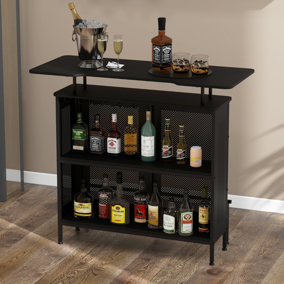 – Inclui 1 tampo, 1 prateleira aberta sob o tampo e 2 prateleiras de dois níveis – 6 suportes para taças, acomodando de 18 a 24 taças – Ideal para vinhos, copos, misturadores, acessórios de bar, baldes de gelo, etc. – Altura perfeita de 107 cm para conversas confortáveis - Frente de metal perfurado protege suas garrafas de vinho – Apoio para os pés em metal para maior conforto dos convidados – Ótimo para sala de estar, cozinha, bar, etc. – Superfície fácil de limpar, economizando seu tempo – Estrutura de metal resistente e pés ajustáveis garantem estabilidade.