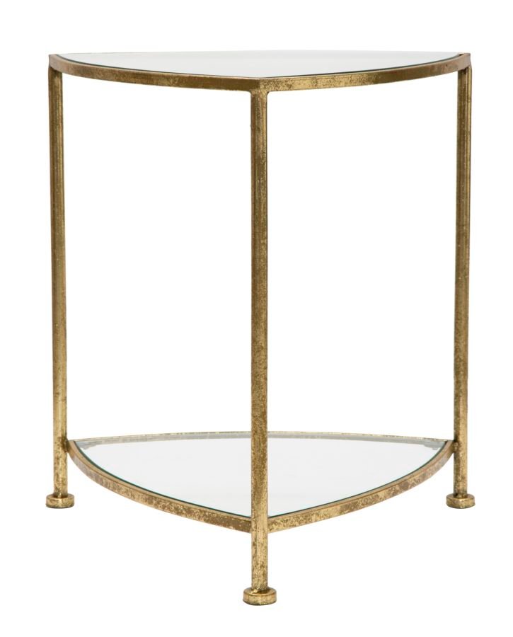 Mesa de cabeceira em metal dourado com prateleira em espelho. A forma triangular particular com lados arredondados cria um efeito envolvente e elegante.