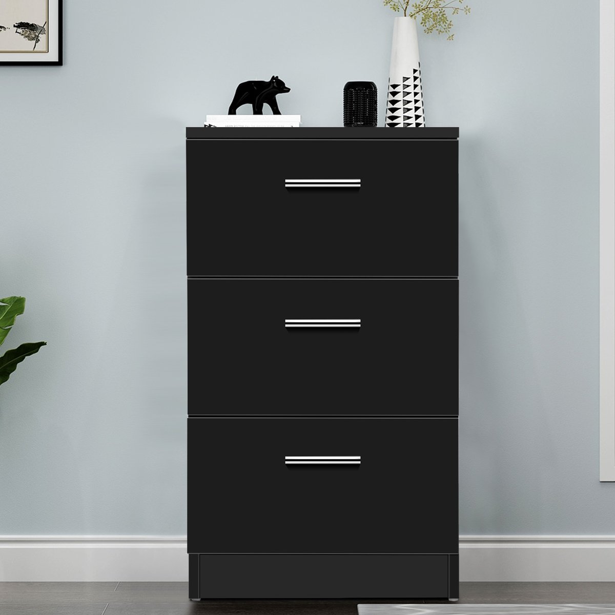 Cômoda com 3 gavetas. Armário clássico perfeito para o seu quarto, sala de estar ou escritório! Amplo espaço de armazenamento – 3 gavetas deslizantes oferecem bastante espaço para seus acessórios favoritos. Materiais de alta qualidade – o armário é feito de aglomerado da mais alta qualidade, graças ao qual oferece resistência, estabilidade e durabilidade incomparáveis. Design clássico – o design clássico e simples combina com qualquer ambiente. Pode ser usado como mesa de cabeceira no quarto ou como cômoda adicional no escritório. Fácil de montar – o armário é muito fácil de montar. Todos os componentes necessários para a instalação estão incluídos no kit.