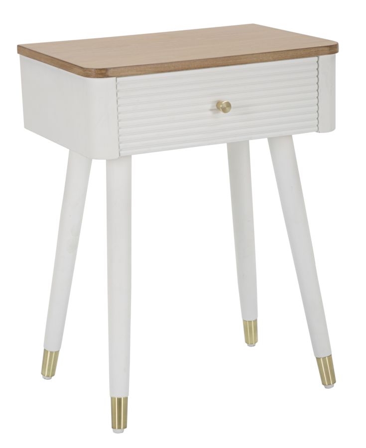 Mesa de cabeceira em madeira branca de linhas simples e essenciais. Completo com gaveta e tampo de madeira marrom. O cabo e os pés em metal dourado dão um toque de classe.