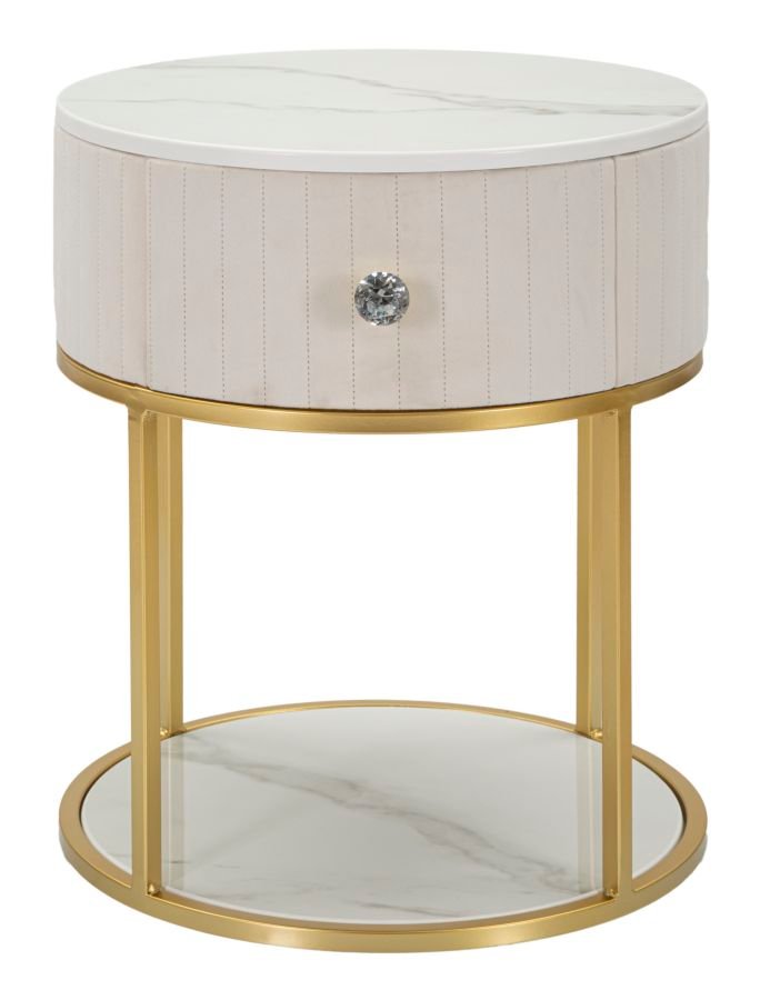 Mesa de cabeceira redonda com estrutura em metal dourado com tampo em imitação de mármore e prateleira e gaveta. A parte superior é forrada com tecido acolchoado de cor creme.