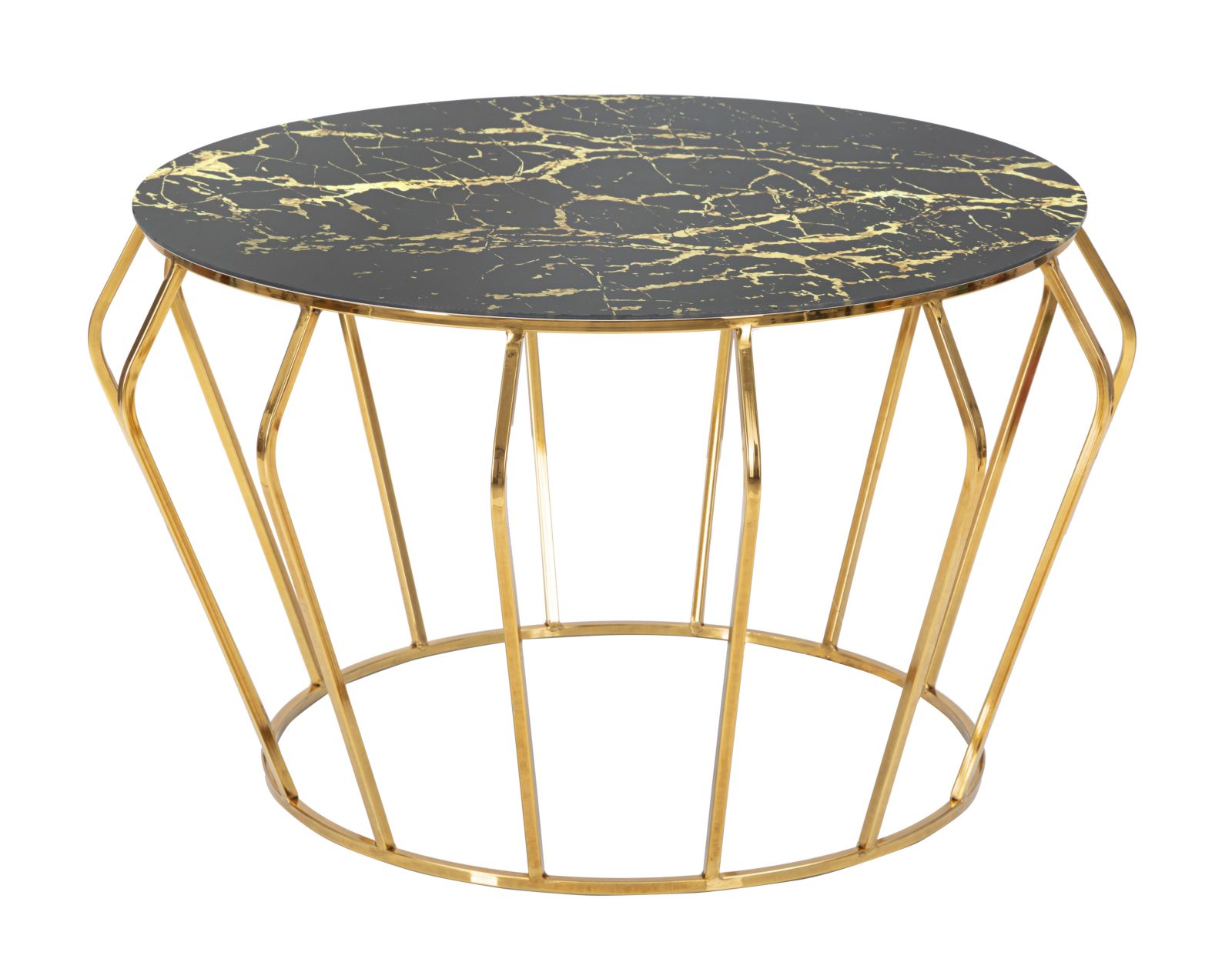 Mesa de centro redonda em metal dourado com tampo de vidro com acabamento em mármore. O design linear e o contraste entre o dourado e o preto criam um efeito elegante e particularmente elegante.
