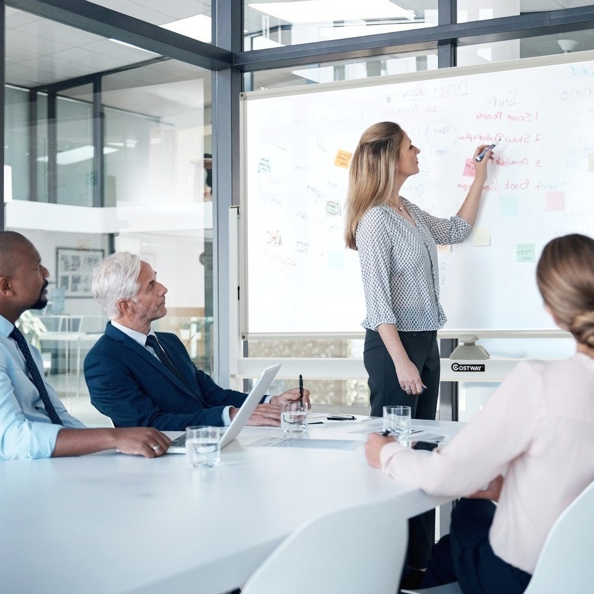 Desfrute de uma jornada de escrita suave com nosso quadro branco móvel magnético de dupla face! Apresentando um design de dupla face magnético, este quadro branco com rodinhas oferece uma grande superfície para escrever. Além disso, há uma bandeja que mantém todos os materiais de escrita em ordem e ao alcance. A altura pode ser ajustada em 2 níveis diferentes para pessoas de diferentes alturas. Com uma técnica de cozimento de 3 camadas, o quadro branco magnético com rodinhas pode servir por muito tempo. A estrutura resistente e as rodas com trava tornam o quadro branco estável durante o uso. E você pode destravar as rodas quando precisar movê-las. As instruções fornecidas oferecem 2 métodos de instalação. Se você está procurando por um produto assim, não hesite em fazer um pedido! Quadro branco ajustável ultragrande para apagar a seco: com um tamanho de 120 x 60 cm, o quadro branco com rodinhas oferece muito espaço para crianças e adultos organizarem suas ideias, darem aulas ou gerenciarem apresentações de trabalho, o que é perfeito para sua casa, escritório ou sala de aula. Com altura ajustável em 2 posições de 145 cm a 165 cm, este quadro branco magnético de pé é adequado para você desfrutar de uma visualização confortável e altura de escrita. Quadro branco de tamanho duplo de 360 ° com sistema de flip e trava: este quadro branco móvel reversível vem com 2 quadros de escrita e um botão que permite que o quadro seja girado e travado no lugar quando você escreve. Vire o quadro branco de tamanho duplo com a facilidade de pendurar e continue a escrever seus pensamentos do outro lado. Grande ajuda para tornar apresentações, ensino ou treinamento mais eficientes e organizados. 4 rodas giratórias com recurso de travamento: este quadro branco grande de dupla face é equipado com 4 rodas giratórias de 360 ° que oferecem a conveniência da mobilidade quando você precisa mover o quadro, seja em pisos duros ou carpete. E cada roda tem um sistema de travamento para manter o quadro branco móvel preso no lugar ao escrever durante sua aula ou apresentação. Construção estável e resistente: ambas as superfícies de escrita são finalizadas com cozimento de 3 camadas de alta qualidade para durabilidade. Além disso, os tubos de aço com revestimento em pó sustentam o quadro branco firmemente, ajudando-o a se manter estável durante o uso. Além disso, os cantos fortes de ABS e a estrutura sólida da estrutura aumentam a estabilidade do quadro branco móvel sobre rodas. Fácil montagem e acessórios completos: Vindo com instruções detalhadas e ilustradas, o quadro branco para escrita a seco é fácil de montar. Existem 2 métodos de instalação para você consultar. E você receberá um pacote incluindo acessórios relacionados, como 1 borracha magnética, 12 ímãs coloridos e 6 canetas hidrográficas.