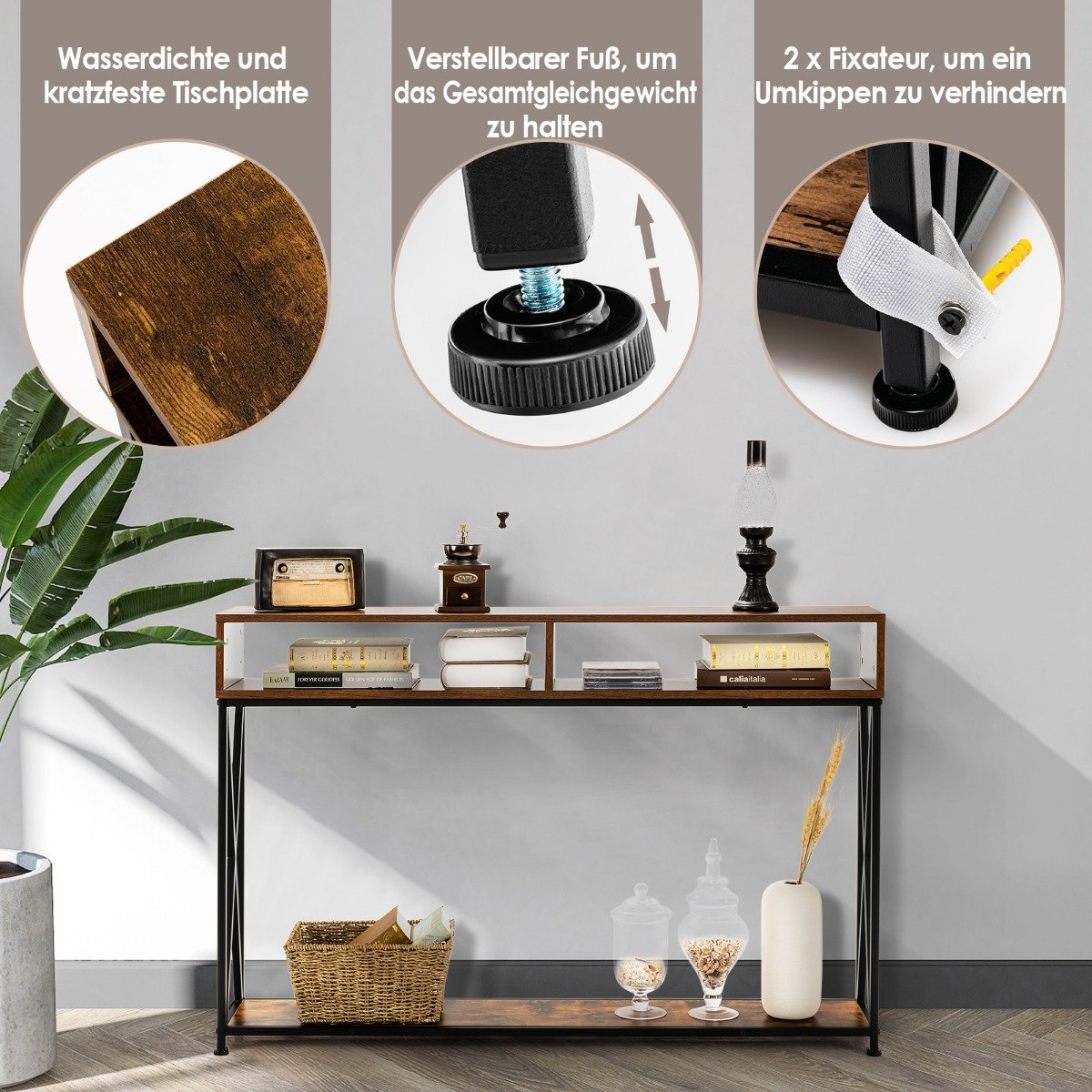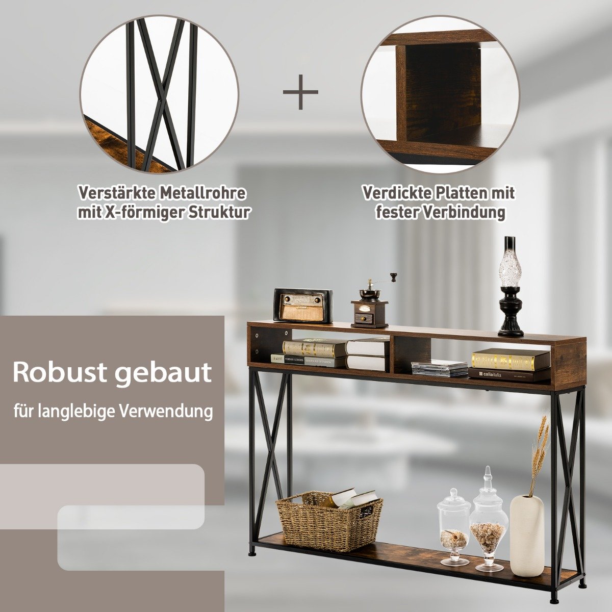 Quer saber como organizar seu corredor? Experimente decorá-lo com esta mesa de console simples! Esta mesa de console com prateleira aberta oferece espaço de armazenamento suficiente e será conveniente para organizar itens como carregadores de telefone, chaves, livros e outros itens. A estrutura de metal em formato de X oferece suporte duradouro para alta estabilidade. As tiras antiderrapantes e os pés ajustáveis ​​também ajudam a manter o equilíbrio geral. Além disso, a superfície é à prova d’água e resistente ao desgaste, sendo muito fácil de limpar. Sua bela aparência a torna perfeita para a decoração da sua casa. É perfeita para ser colocada na entrada, atrás do sofá ou encostada na parede da sala de estar. Se você procura uma mesa de console como esta, não hesite em fazer um pedido! Estrutura de aço robusta e placas espessas tornam-no mais estável. A estrutura em X fornece suporte extra e o torna mais elegante. Prateleiras abertas e compartimentos de armazenamento fornecem amplo espaço para necessidades básicas. Pés ajustáveis ​​para manter o equilíbrio em terrenos irregulares. Formato fino e compacto disponível para espaços estreitos. Multifuncional adequado para sala de estar, entrada e corredor. A aparência simples e industrial se adapta a várias decorações de casa. A superfície lisa e à prova d’água é fácil de limpar com um simples pano. Fácil montagem de acordo com as instruções detalhadas.