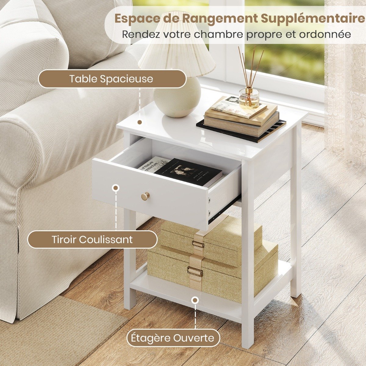 Eleve o ambiente do seu quarto com nossa requintada mesa de cabeceira, uma fusão perfeita de glamour moderno e elegância atemporal. Seu design clássico exala um charme sofisticado que adiciona um toque de luxo ao seu espaço de convivência. O generoso espaço de armazenamento oferecido pelo amplo tampo da mesa, gaveta deslizante e prateleira aberta garante praticidade e organização ao seu alcance. Feita com pernas resistentes e painéis espessos, esta mesa de cabeceira garante uma estrutura sólida e durável que resistirá ao teste do tempo. Versátil e adaptável, ela se integra harmoniosamente a vários ambientes internos, como sala de estar, quarto ou escritório, aprimorando a funcionalidade e a estética. Atributos: 【Espaço de armazenamento extra】Com o tampo espaçoso da nossa mesa de cabeceira, você terá amplo espaço para colocar seu porta-retratos, livro ou abajur. A gaveta deslizante oferece armazenamento conveniente para seus itens pessoais, e a prateleira aberta é perfeita para vasos de plantas ou caixas de armazenamento. 【Estrutura confiável】A mesa de cabeceira possui pernas resistentes que garantem uma estrutura confiável. Além disso, os painéis espessos tornam-no mais resistente ao desgaste e duram mais. Não há dúvida de que esta mesa de cabeceira é uma peça de mobiliário que resistirá ao teste do tempo. 【Adequado para vários cenários】Nossa mesa de armazenamento é adequada para vários ambientes internos. Seja na sala de estar, quarto, escritório ou escritório, esta mesa de armazenamento é altamente adaptável para adicionar funcionalidade e beleza. 【Detalhes fáceis de usar】As almofadas antiderrapantes podem proteger seu piso de arranhões e adicionar estabilidade extra. Com a alça conveniente e as corrediças de metal suaves, você pode abrir e fechar a gaveta facilmente. Além disso, a superfície lisa é fácil de limpar, economizando tempo e energia. 【Aparência elegante】Nossas mesas de cabeceira combinam design moderno com elegância chique. A mesa lateral de design clássico traz um toque vibrante ao seu quarto, mantendo a disposição dos móveis longe da monotonia.