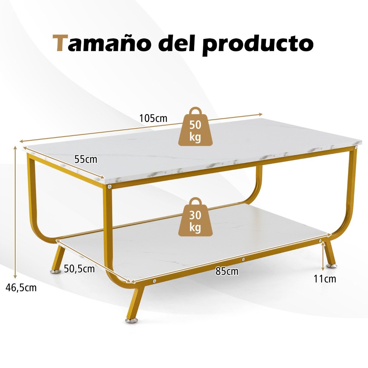 Mesa de centro retangular com tampo de imitação de mármore e estrutura de metal, com 2 níveis – Branca
