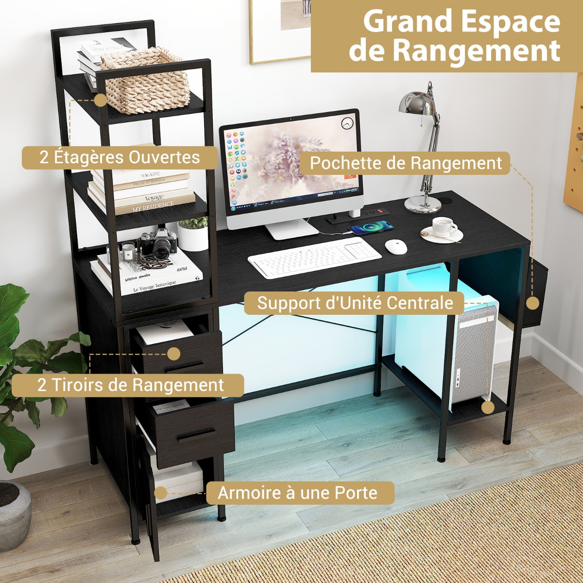Mesa de escritório moderna com luzes LED e tomadas, prateleiras abertas, 2 gavetas, compartimento para CPU e porta-objetos na cor preta.