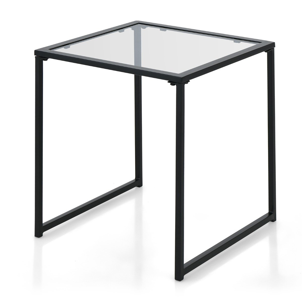 Mesa lateral de vidro temperado com estrutura metálica para uso interno e externo.