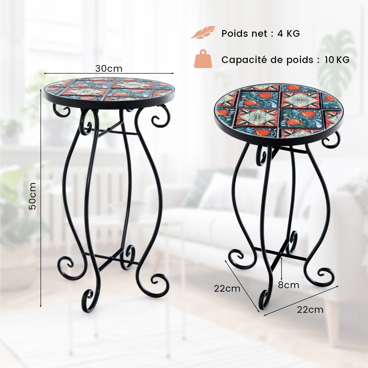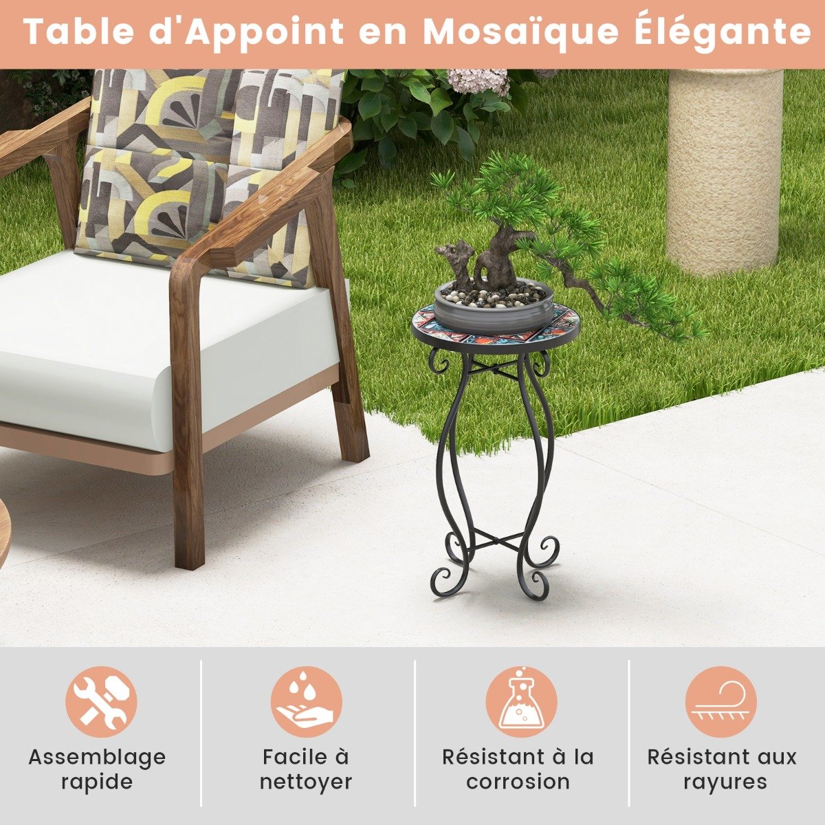 Os padrões de mosaico floral no tampo da mesa não só fornecem uma bela estética, mas também resistem ao desbotamento, o que garante um uso duradouro. Apoiada por uma estrutura de metal resistente com estrutura em forma de X e conexão de parafuso firme, esta mesa oferece excelente estabilidade e durabilidade. Seu tamanho adequado e aparência atraente a tornam perfeita para colocar ao lado de cadeiras de lazer para fácil acesso a lanches e bebidas, ou como um suporte de plantas elegante. Seja usada em ambientes internos ou externos, a atraente mesa lateral sempre será uma adição cativante a qualquer espaço. Se você está procurando uma mesa lateral de mosaico como esta, não hesite em fazer um pedido! Padrões de mosaico atraentes: Os padrões de mosaico floral no tampo da mesa adicionam um toque de elegância ao ambiente, tornando esta mesa lateral uma decoração perfeita. Além disso, o azulejo de cerâmica não é apenas bonito, mas também antidesbotamento, garantindo uso a longo prazo. Estrutura de metal resistente: Toda a mesa de destaque é suportada por uma estrutura de metal reforçada que é à prova de ferrugem e super resistente. E a estrutura de metal em forma de X e a conexão de parafuso firme melhoram muito a estabilidade geral. Múltiplas Funções: Com sua aparência atraente e tamanho adequado, esta mesa lateral redonda é perfeita para colocar ao lado de cadeiras de lazer para fácil acesso a lanches e bebidas. Além disso, também pode ser um belo suporte para plantas para seus vasos de flores. Aplicação em ambientes internos e externos: O design curvo e atraente das pernas da mesa torna esta mesa lateral mais atraente. E será o complemento perfeito para ambientes internos e externos, como varandas, jardins, salas de estar e assim por diante. Montagem sem complicações: Com instruções claras, você pode montar esta mesa lateral com alta eficiência e menos esforço, o que permite que você desfrute da elegância e da funcionalidade da mesa lateral instantaneamente.