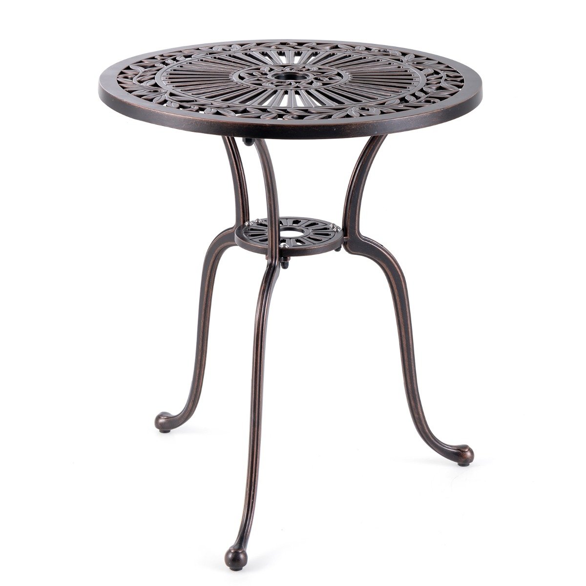 Mesa redonda de alumínio fundido de 60 cm (24 polegadas) para área externa, estilo bistrô, com furo para guarda-sol de 5 cm (2 polegadas) – Cor cobre
