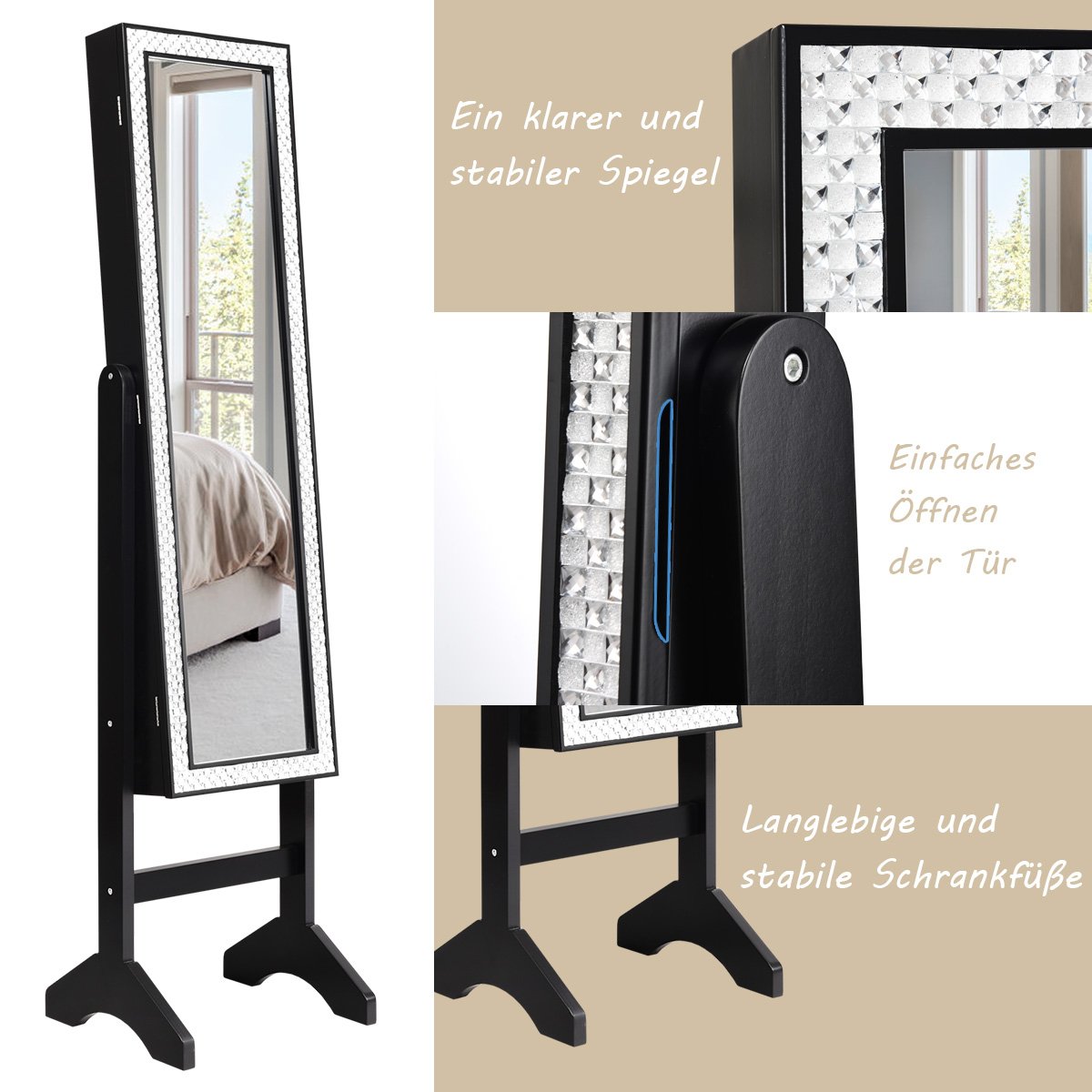 O armário para joias com espelho de tamanho normal é uma obra de arte atraente. Ele foi especialmente projetado para todos os seus objetos de valor, ajuda a organizar suas joias e evita que elas se enrosquem, mantendo-as seguras e longe do alcance das crianças. Além disso, seu design chique e estiloso com diamantes de resina embutidos combina com a decoração do seu quarto. Com ele, sua vida será conveniente e autoconsistente. Vale a pena ter! Se você está procurando por uma joia dessas, não perca esta. 5 linhas para anel ou brinco, 19 ganchos, 3 prateleiras de armazenamento Com espelho de tamanho normal, é conveniente para você experimentar suas roupas ou joias Os diamantes de resina embutidos são sofisticados e elegantes. Combina com a decoração do seu quarto Ajuda a organizar suas joias e evita que elas se enrosquem Inclina-se facilmente para ajuste de ângulo com um suporte resistente Fácil de montar e limpar