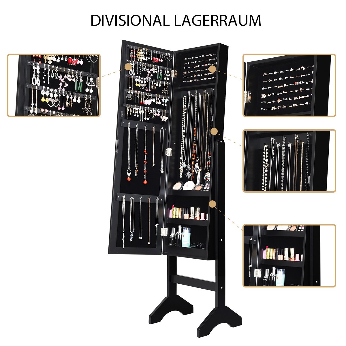 Organizador de armário para joias espelhado com luzes LED – Preto