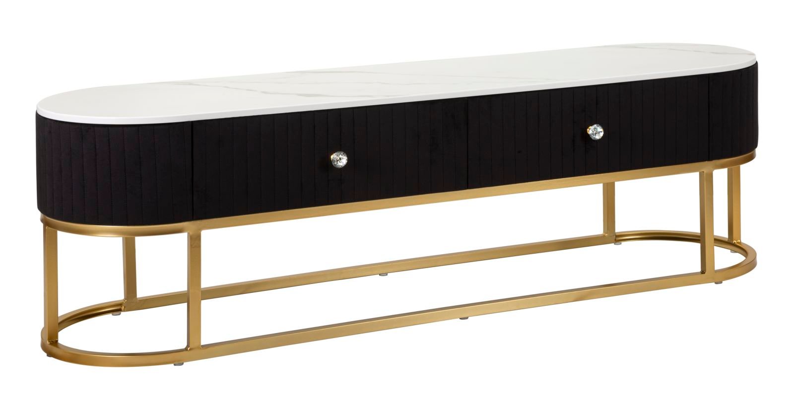 Móvel de TV com laterais chanfradas e gaveta. A estrutura metálica dourada, a parte superior forrada em tecido acolchoado preto e o tampo em imitação de mármore criam um contraste elegante que pode ser combinado com qualquer tipo de móvel.