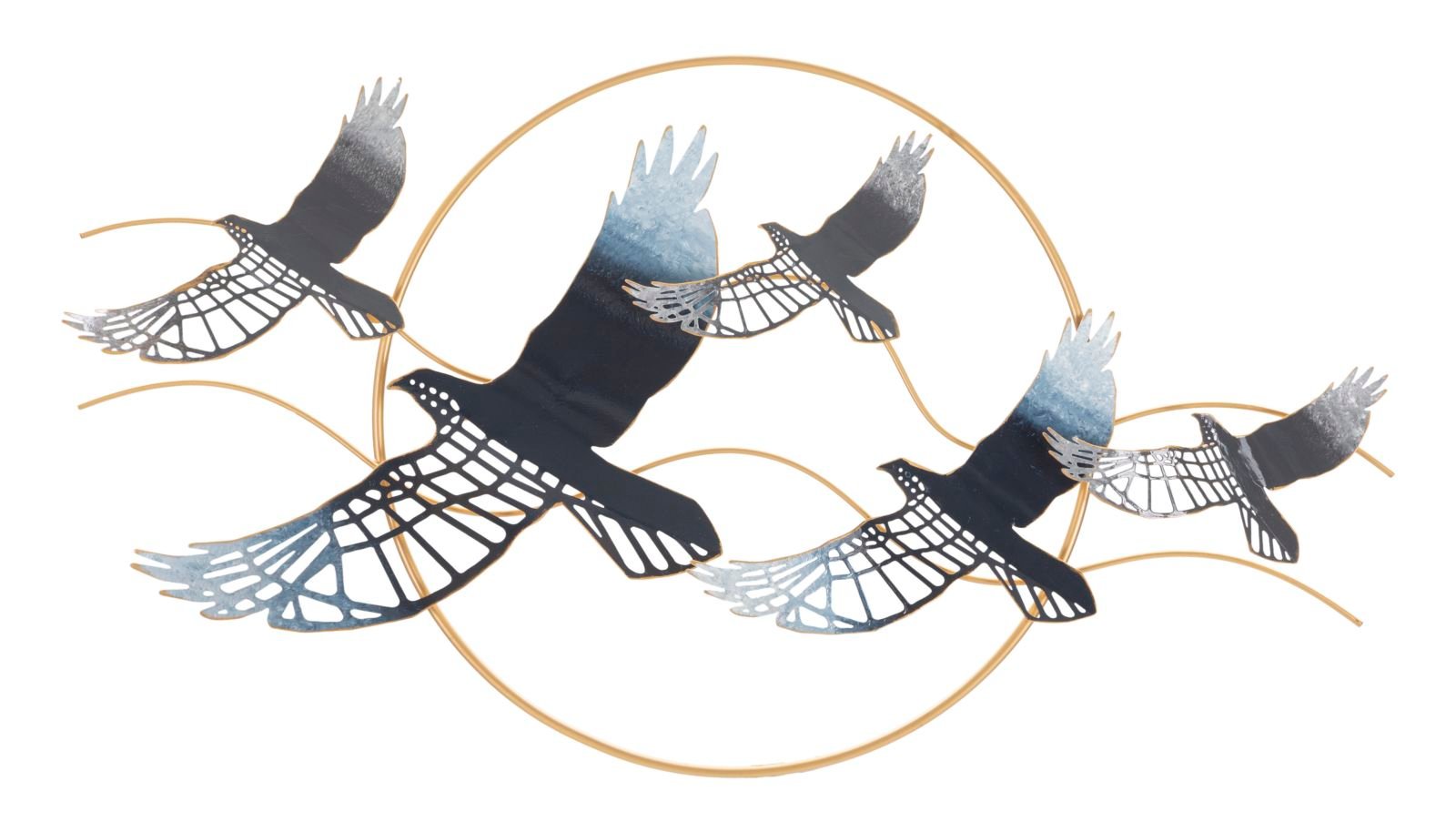 Painel de parede decorativo em metal 3D representando pássaros voando de várias cores com elegante moldura redonda de metal dourado.