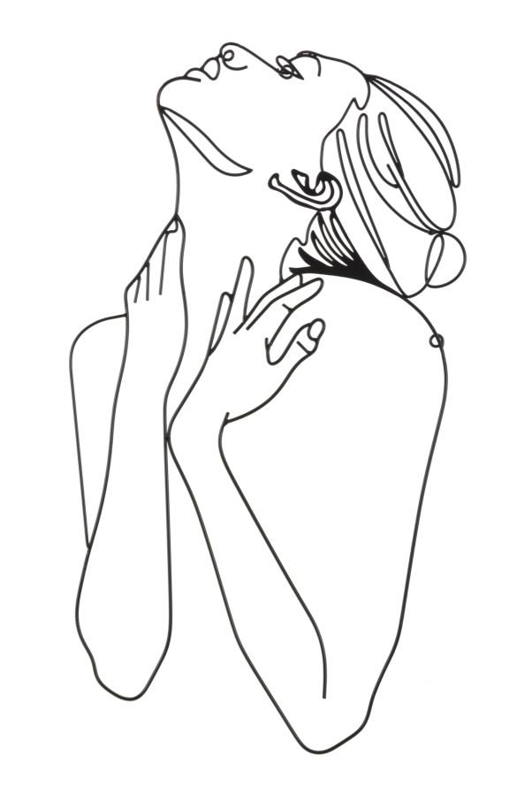 Painel de parede decorativo 3D em metal preto com traços delicados e sinuosos que compõem a figura de uma menina.