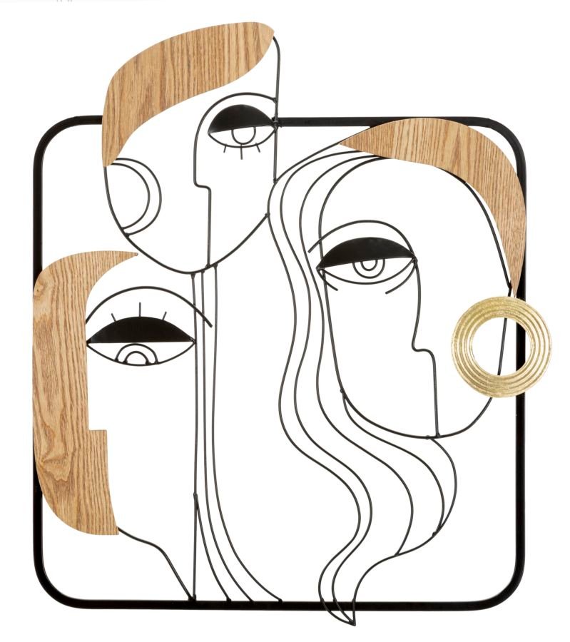 Painel decorativo de parede 3D em metal e madeira representando rostos com características que remetem à arte cubista.