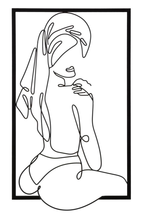 Painel de parede decorativo 3D em metal preto com traços delicados e sinuosos que compõem a figura de uma mulher com cocar sentada por trás.