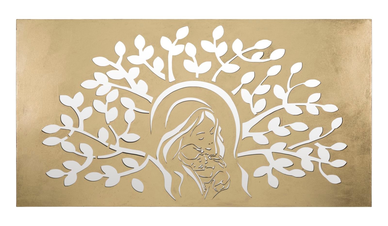 Painel decorativo 3D retangular em metal dourado com espelho. A escultura específica cria o desenho do presépio. Um toque requintado para cada ambiente.