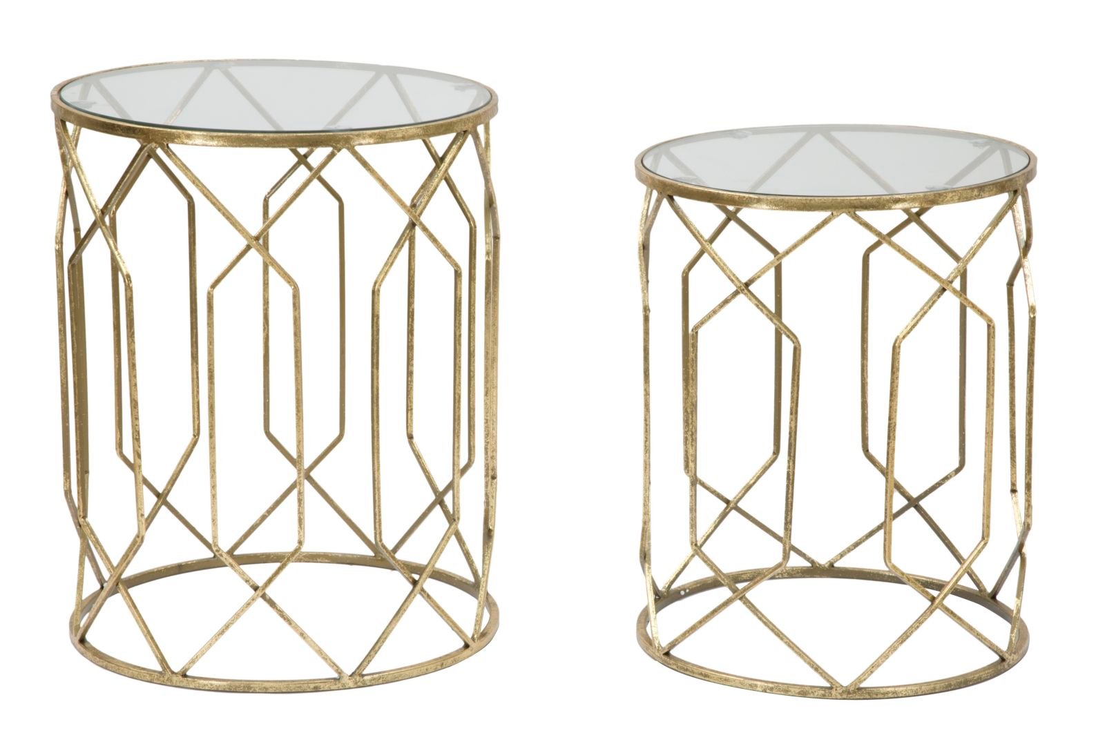 Par de mesas redondas de metal e vidro. O ouro combinado com o vidro cria um forte impacto. Um elemento luxuoso e glamouroso para sua casa.