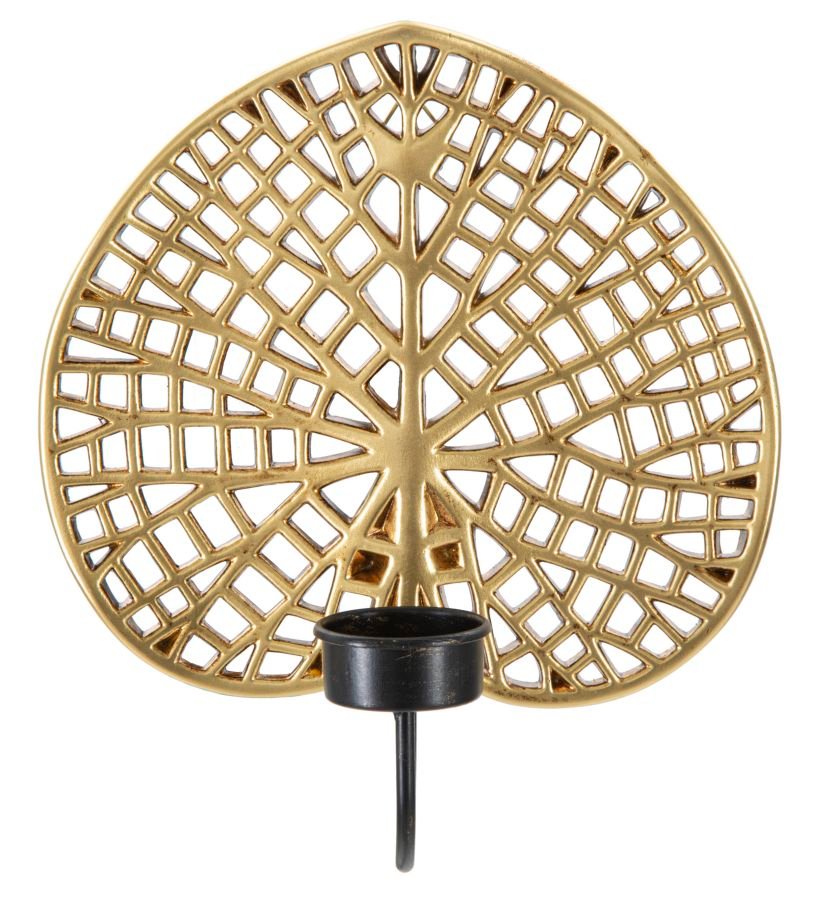Elegante castiçal de parede em metal dourado e preto em forma de folha de lótus. Um toque exótico e glamouroso para sua casa.