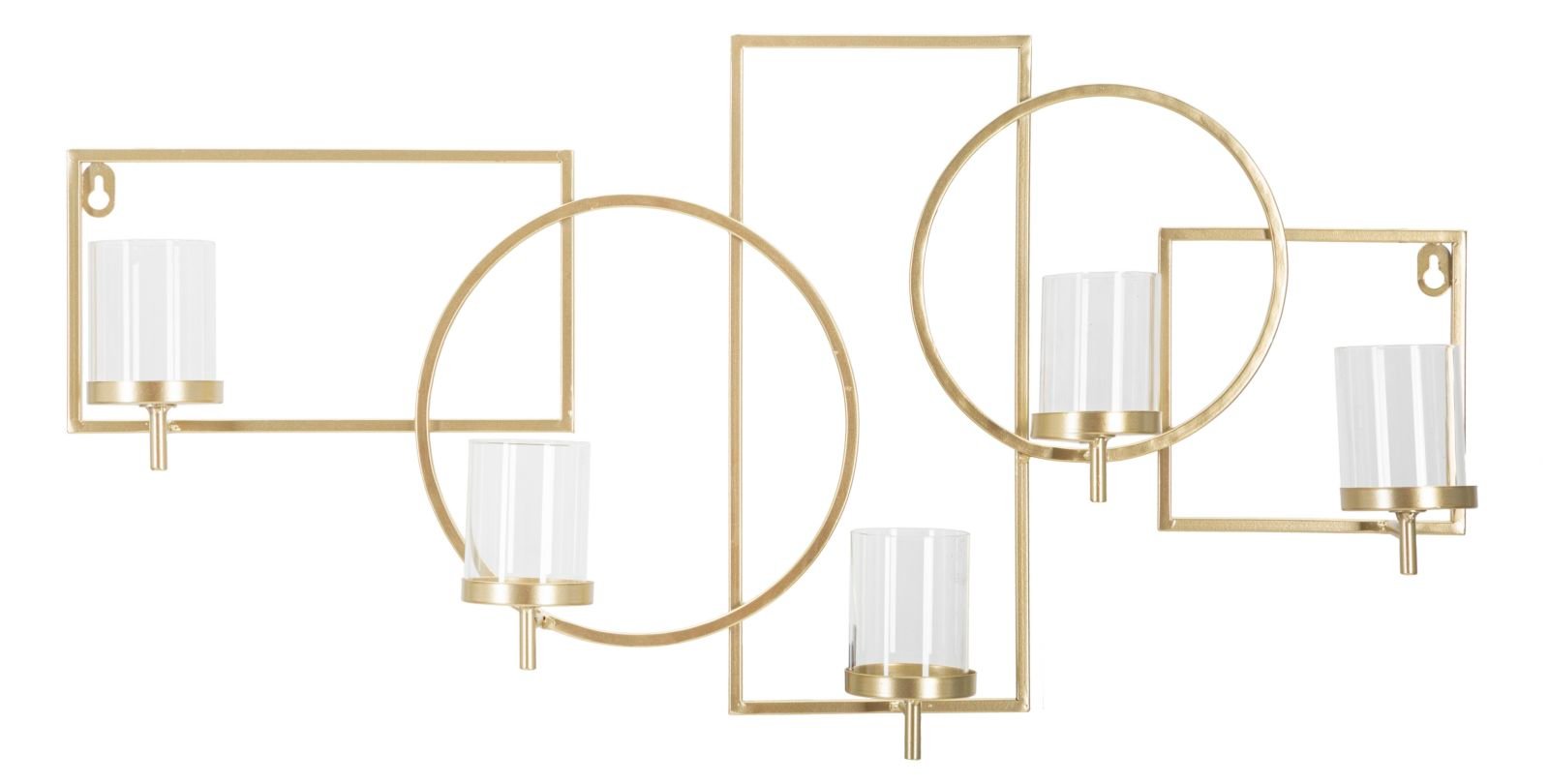 Castiçal de parede em metal dourado com desenho geométrico composto por círculos e retângulos. É composto por 5 pequenos castiçais de vidro.