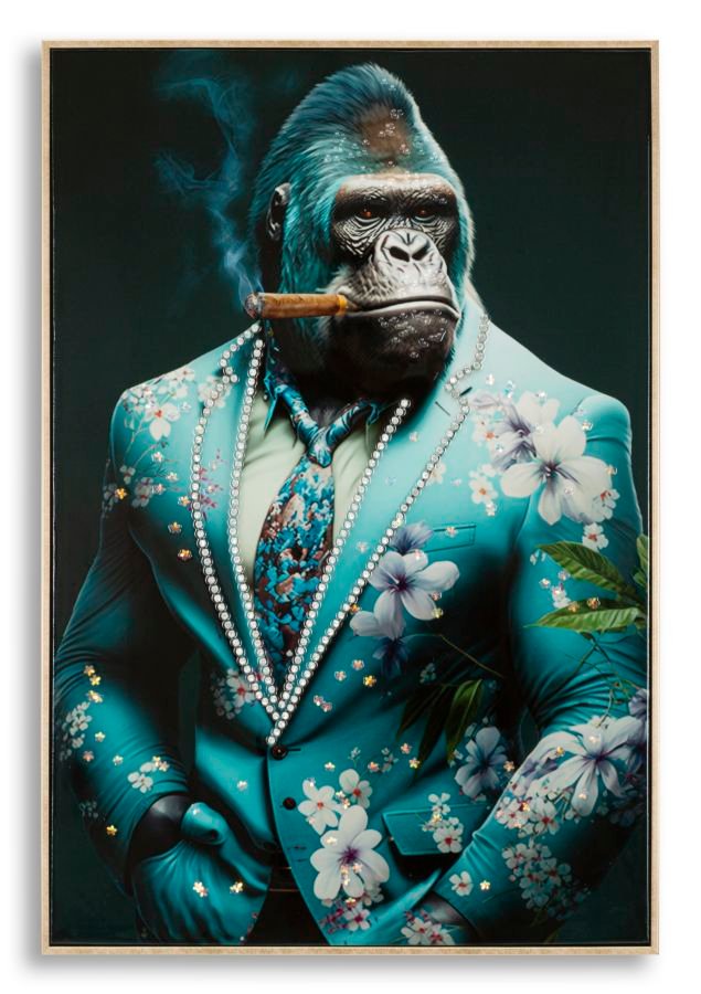 Pintura sobre tela com moldura de madeira e moldura dourada. gorila fumando um charuto, vestido com um terno elegante com detalhes em relevo. Perfeito para dar um toque único a qualquer ambiente.