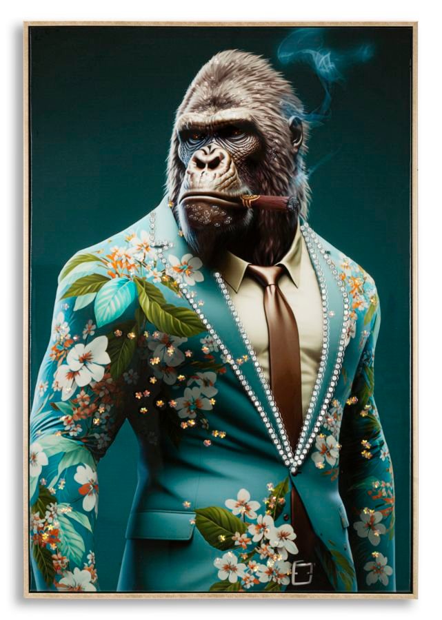 Pintura sobre tela com moldura de madeira e moldura dourada. gorila fumando um charuto, vestido com um terno elegante com detalhes em relevo. Perfeito para dar um toque único a qualquer ambiente.